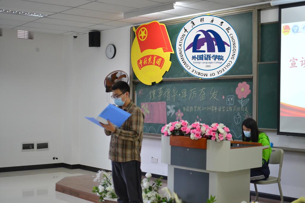 在外国语学院团总支书记吕戈老师宣读完《外国语学院第三届第四任学生干部名单》后,进行本次启动仪式最重要的环节——交接团旗。由第三届三任团总支学生副书记吴德亮将团旗递至第三届四任团总支学生副书记王茂荣的手中,团旗的交接是新的传承,责任的顺承,而外国语学院三届四任学生组织在注入新鲜血液后,也将站在前人的肩膀上,不断创新、奋进,将那属于自己的烟火共同绽放在属于外国语学院三届四任这片海阔的夜空中。