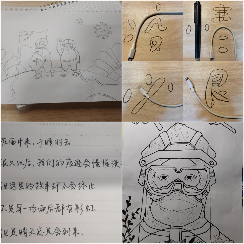 疫情当下,同学们对在这期间发生的事情都有着很深的感触。大家纷纷化身为画家,书法家,诗人等,利用不同的材料和别样的形式表达出对疫情的感受、展现对奔赴一线无私奉献的医护人员、老师、志愿者们最真挚的礼赞,大家的自主创作传递出温暖与感谢的心声,抗“疫”热情的文字作品、绘画作品、书法作品、抗疫日志无不表达出同学们坚定抗疫的信念。