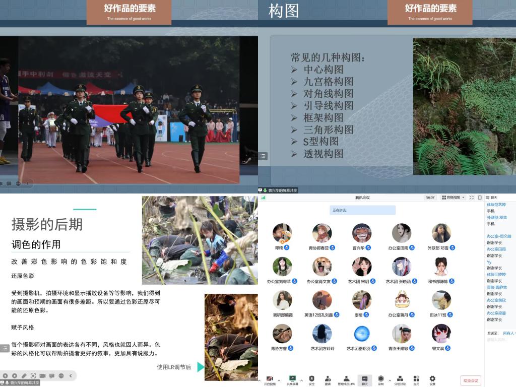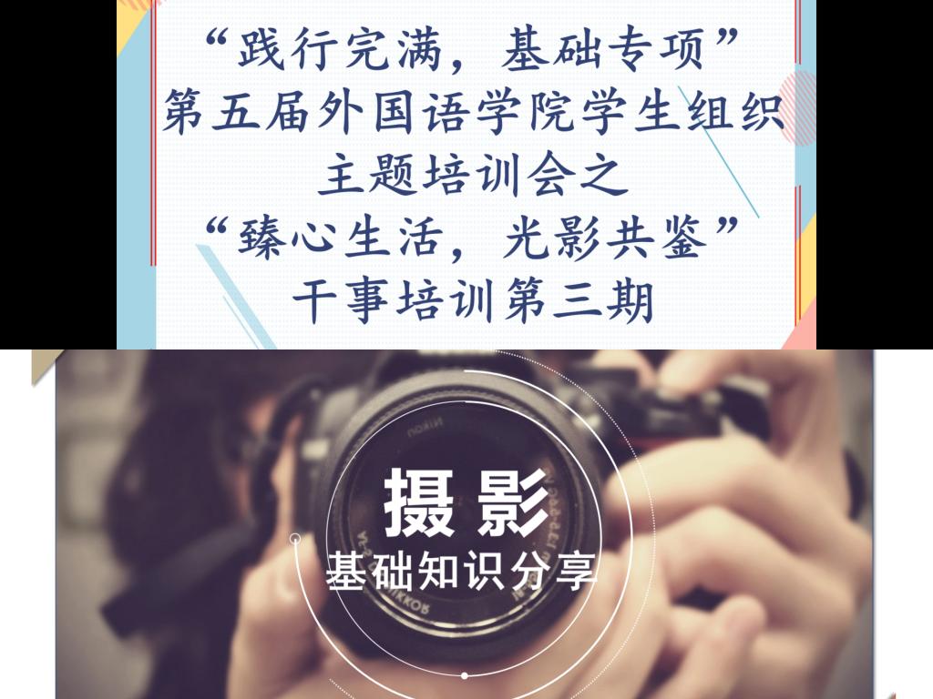 为进一步培养外国语学院学生组织各干事摄影能力,从而保证各部门活动的完美开展。特此外国语学院学生会办公室于12月14日下午13:00通过线上腾讯会议形式举行“践行完满,基础专项”——第五届外国语学院学生组织主题培训之“臻心生活,光影共鉴”干事培训第三期活动。本次干事培训将以摄影技巧为主,提高干事的工作能力,提高干事的工作效率,发挥其主观能动性,加强干事之间的交流,为以后的学生工作打下扎实的工作基础。本次培训特别邀请到信息工程专业曹兴华学长为大家细心讲解。
