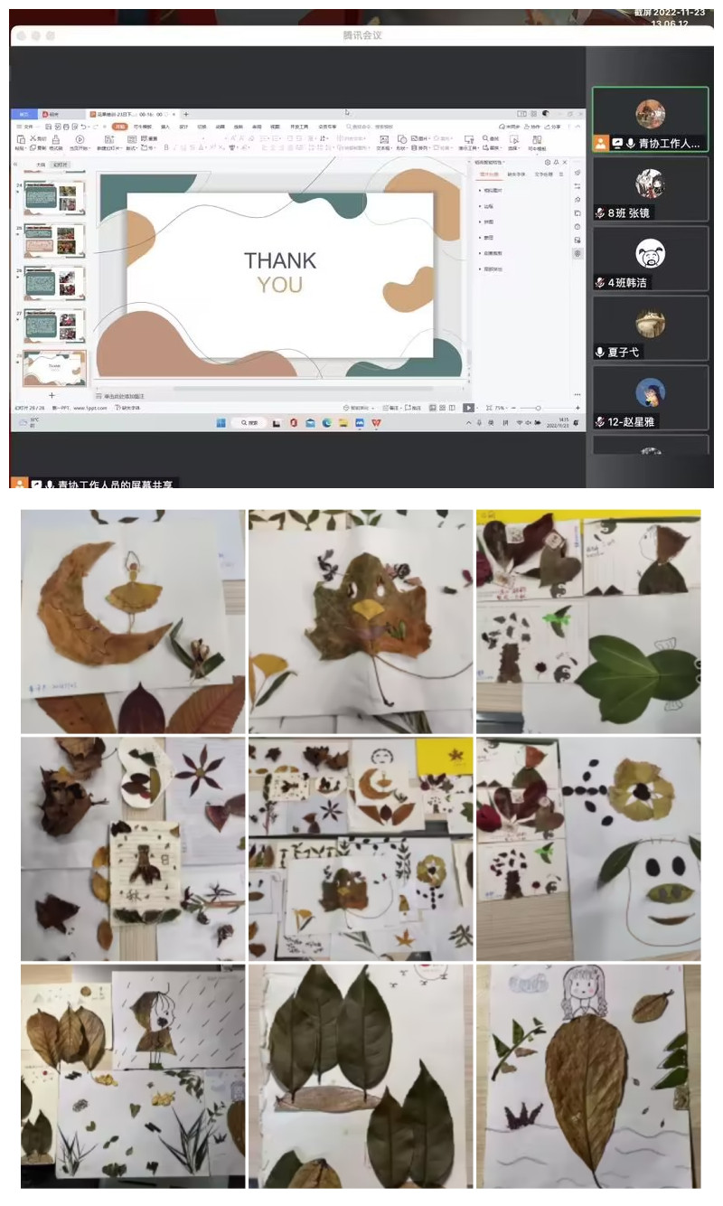 2022就要结束了,回顾12月份,外国语学院青年志愿者协会怀揣着爱心与热情开展了一系列活动。疫情常态化的转变和全国开放的政策考验着同学们的自觉,志愿活动也在紧张有序中不断开展。放松同学们的消极情绪,给同学们带来了众多的欢乐,让同学们感受到了温暖。11月25日,外国语学院花果培训第一期线上活动圆满开展并结束,本次活动增强了同学们对完满教育的认知,也提高了同学们对志愿服务的热情。相信在接下来的志愿活动中,能够更好地完成服务。12月7日,外国语学院“解忧杂货铺”第三季之减“负”不减“趣”创意落叶拼图活动圆满开展,经历了疫情的突袭,同学们心中肯定有了一定的压力与害怕,为缓解这种压力,这次活动让同学们用树叶通过自己的想象力创造出不一样的图画。树叶只是生活中很常见的事物,但是也能够创造出不一样的价值,这不仅提高了同学们的兴致,也赋予了树叶不一样的价值。