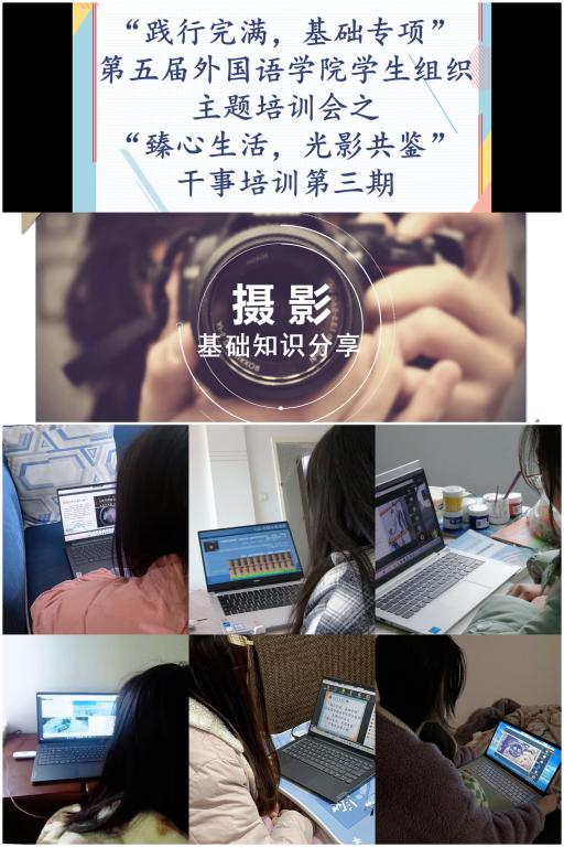 一张好的照片可以让冰冷的文字拥有色彩,摄影是当代大学生应当具备的一项基础技能。为进一步培养外国语学院学生组织各干事摄影能力,从而保证各部门活动的完美开展。特此外国语学院学生会办公室于12月14日下午13:00通过线上腾讯会议形式举行“践行完满,基础专项”——第五届外国语学院学生组织主题培训之“臻心生活,光影共鉴”干事培训第三期活动。本次培训特别邀请到信息工程专业曹兴华学长为大家细心讲解。学长从认识照相器材、好作品的要素、相机的实践操作三部分进行培训。并让大家通过手机上的相机功能,进行实践操作,逐一解答大家所存在的疑问。通过以上讲解,各干事们的摄影能力得到有效改善,也进一步提高了各干事对一张完美照片的背后有了新的认识。由于疫情大部分同学已返乡,本次线上活动共有150人参加。