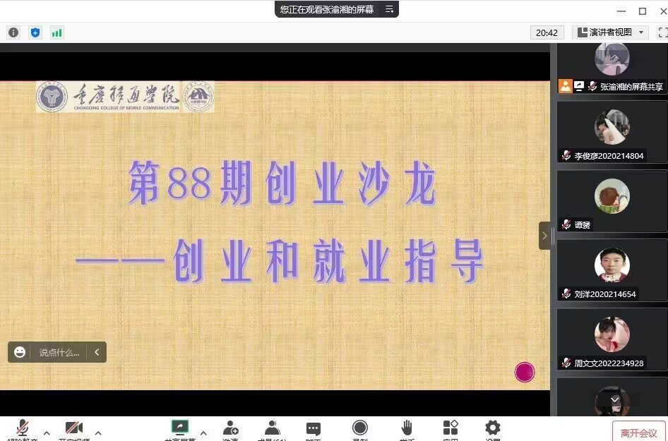 为了帮助大学生在毕业以后面临工作这一大难题上,外国语学院团总支就业助理团,在2022年12月14日下午14:00于腾讯会议开展了第88期创业沙龙-创业及就业指导活动。本次活动有幸邀请到了智能工程学院庞松林老师来为我们进行讲解。活动伊始,老师通过“你真的爱钱吗?”这一问题引入话题,然后接着讲述为了赚到更多的钱需要具备哪些能力,以及需要改正自己身上哪些缺点。面对同学们的疑问,耐心地为同学们解答,在活动结束时庞老师也为大家送去了“与其在那躺着权衡利弊,不如爬起来去追寻结果,结果能给你的,比你想象的更多”这一激励鼓舞的话语,活动在老师的美好祝愿下圆满完成。本次活动参与人数共计103人。