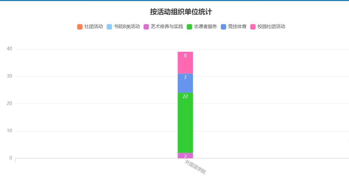 蹴就着三月滚烫的完满教育,外国语学院的数据分析也实时更新。外国语学院共推出36场完满教育特色活动,其中校园社团活动6场,艺术修养与实践2场,志愿者服务22场,竞技体育6场,覆盖人数约5200人次,活动平均人数约200人次。外国语学院三月数据分析报告如下:
