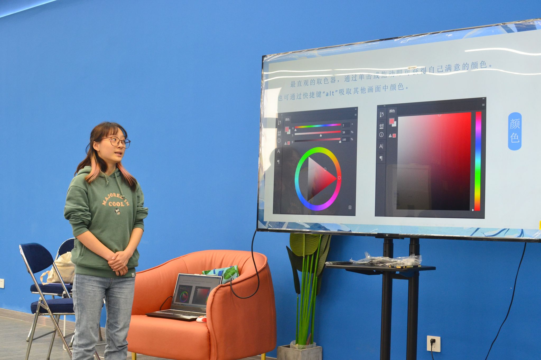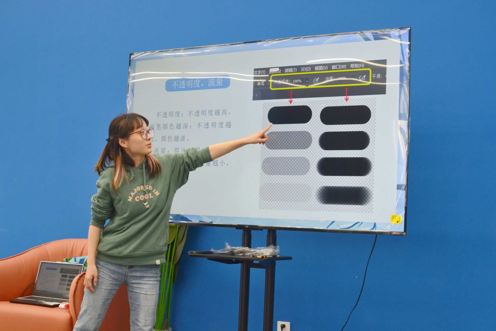 外国语学院团总支安娅雯学姐上台后热情地向学员们介绍今天培训内容,在学姐的诉说下学员们用热烈的掌声与和切的笑语回应着学姐生动的介绍。一语毕,学姐通过实际操作亲手演示的方式,一步一步的向学员们传授ps知识点,从理论到实践,从基本操作到深入工具,都在让青马学员们更深层次的了解ps的操作,共感ps的乐趣以及经过自己的巧手处理后见到最终效果的成就感。二语开,学姐深入青马学员当中去,亲手教学青马学员们利用ps工具绘制属于自己的图画,学员们也积极与娅雯学姐互动,在你来我往的欢声笑语中,今天的培训接近了尾声。