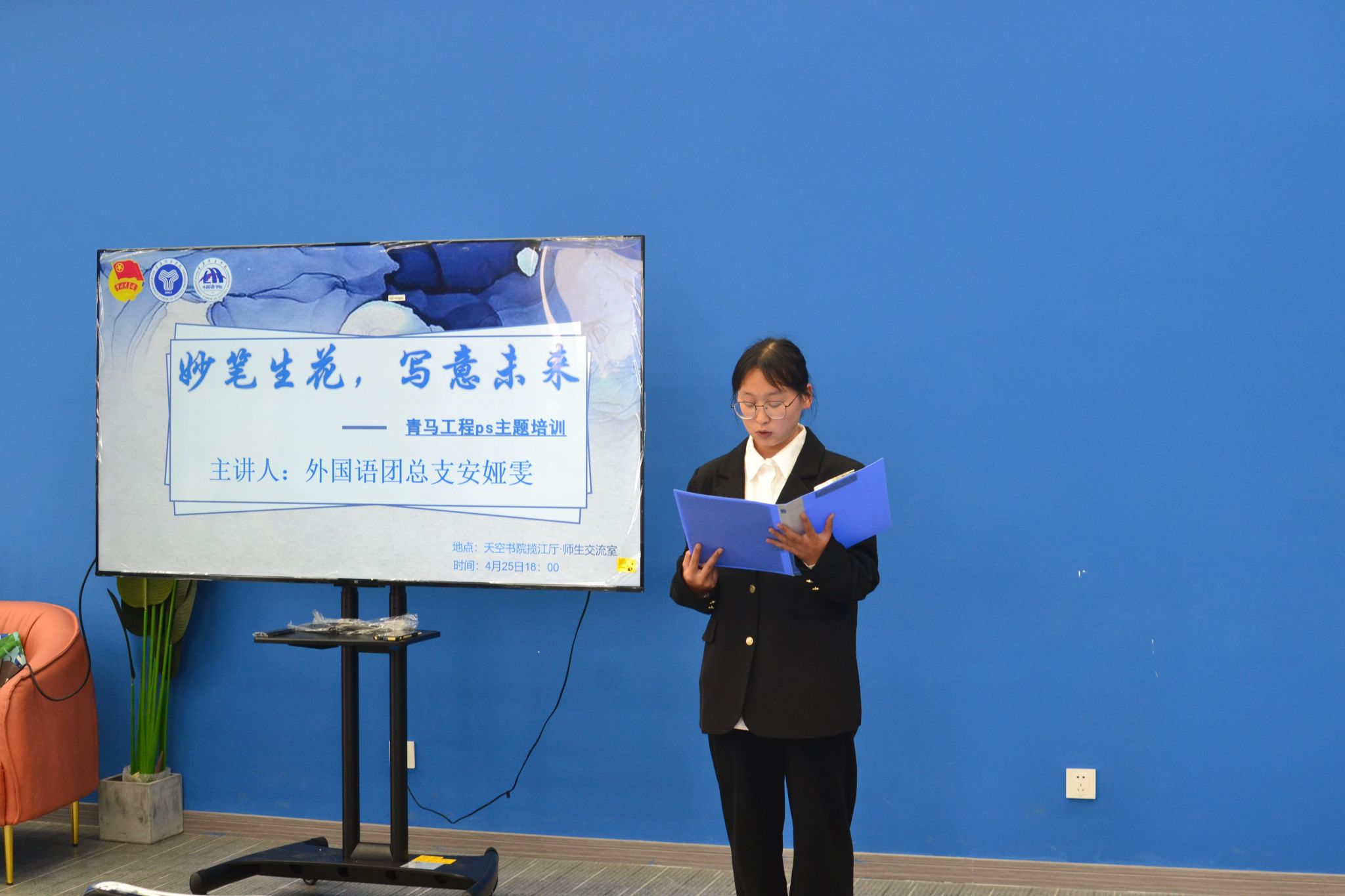 为加强外国语学院青马工程初阶班学员的更深层次的综合素质能力,提高宣传能力并促使学员们进一步掌握实践操作能力,故而特别邀请到外国语学院团总支安娅雯学姐于2023年4月25日在天空书院举办“妙笔生花,写意未来”——外国语学院青马工程初阶班ps培训第二期,本次培训旨在助推青马工程学员们在不断地实践中成就自我,向阳盛开,写意未来人生。