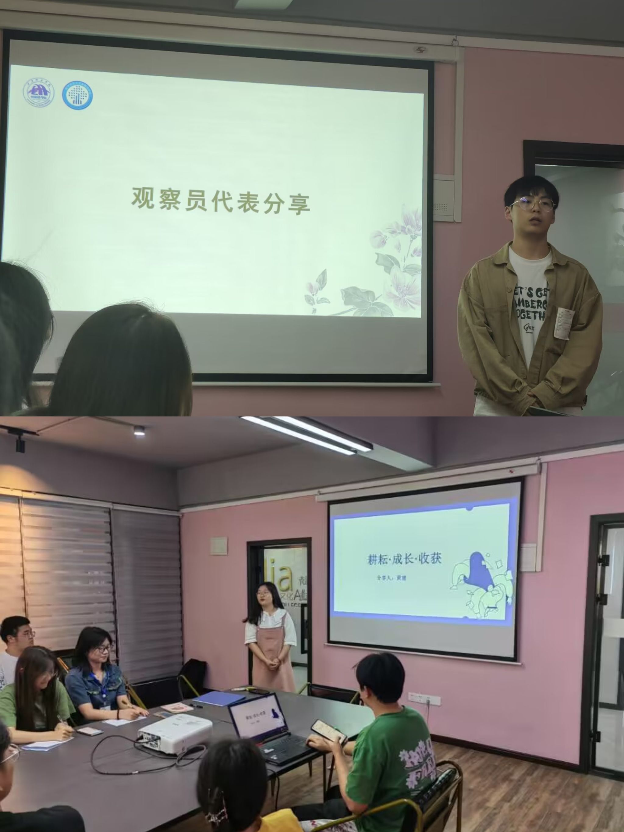 会议伊始,Starlight完满观察团成员黄建用“耕耘·收获·成长”三个关键词分享了她在观察团的成长以及工作经历,对本学年完满观察团的工作做总结。黄建同学分享到从“手把手”教观察团成员填写资料到每个观察员都能够独当一面,在这过程中,亲眼见证观察团的成长,各种回忆历历在目仿佛发生在昨天。数字经济与信息管理学院观察团张云龙分享了他作为专升本的同学,从初次工作的忙乱到能够管理好团队、从怎样带领团队中获得很多新体验,在工作的同时也感受到了观察团这个大家庭的温暖。