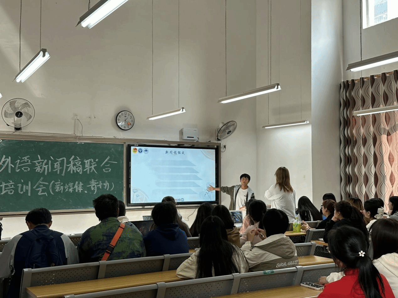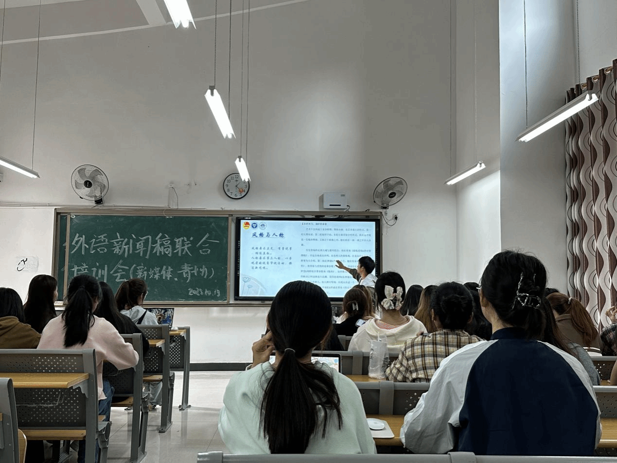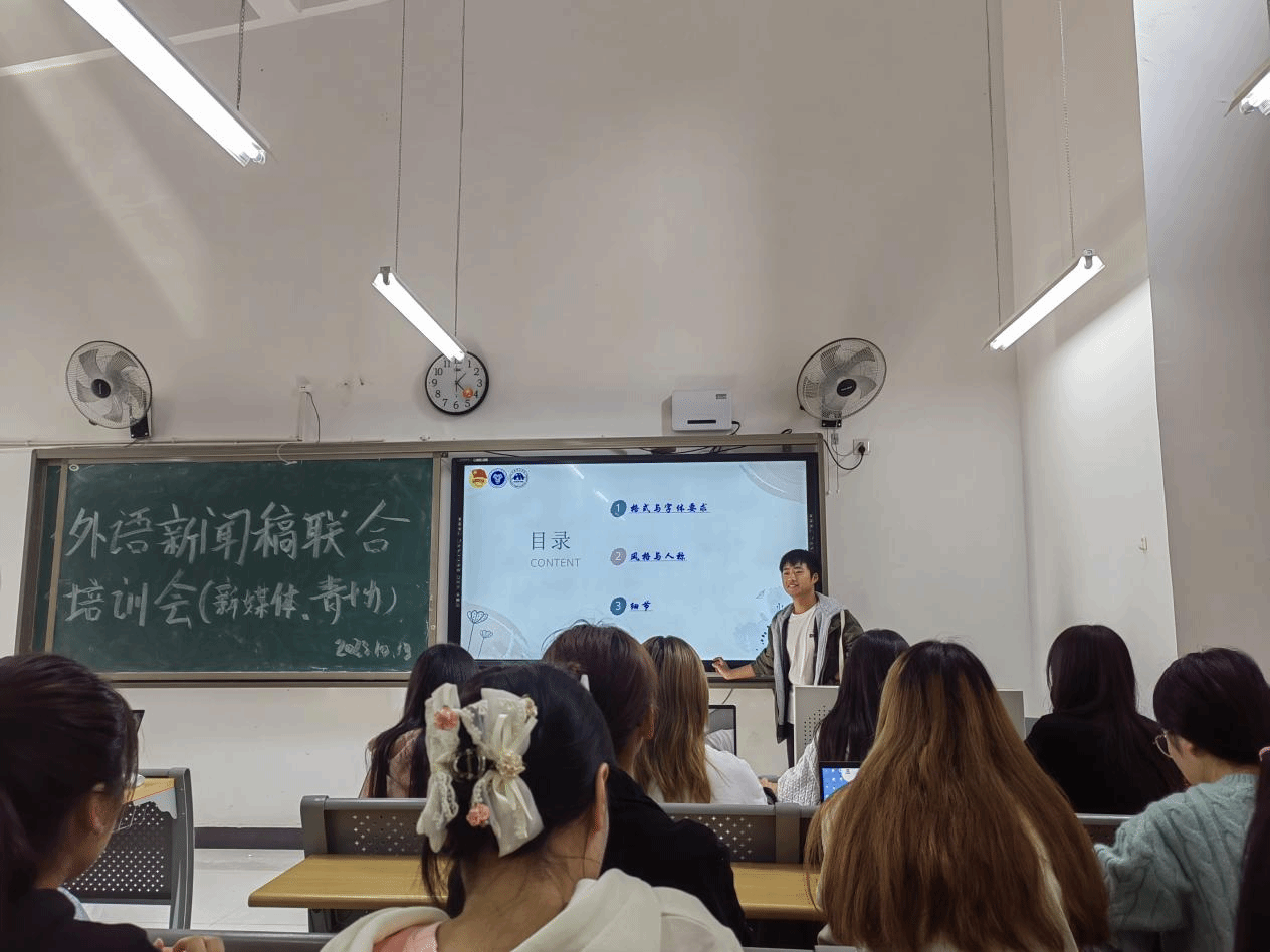 为更好地展现外国语学院完满风采,促进外国语学院骨干更好的全面发展,帮助其更好的适应角色,融入工作,提高工作效率,外国语学院新媒体与外国语学院青年志愿者协会于10月13日中午12:30在天渠104教室开展了一次以“玩转新媒体,写好新闻稿”为主题的新闻稿培训会。
