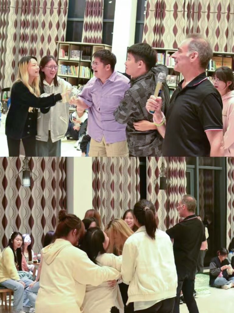 轻松愉快的趣味游戏环节为同学们搭建了一个与Clive亲密互动的平台。第一场游戏——“你演我猜”。该游戏由Clive给大家提供一个词语,同学们通过丰富的肢体语言向组员表达关键词义,猜出正确答案。有趣的动作引得全场