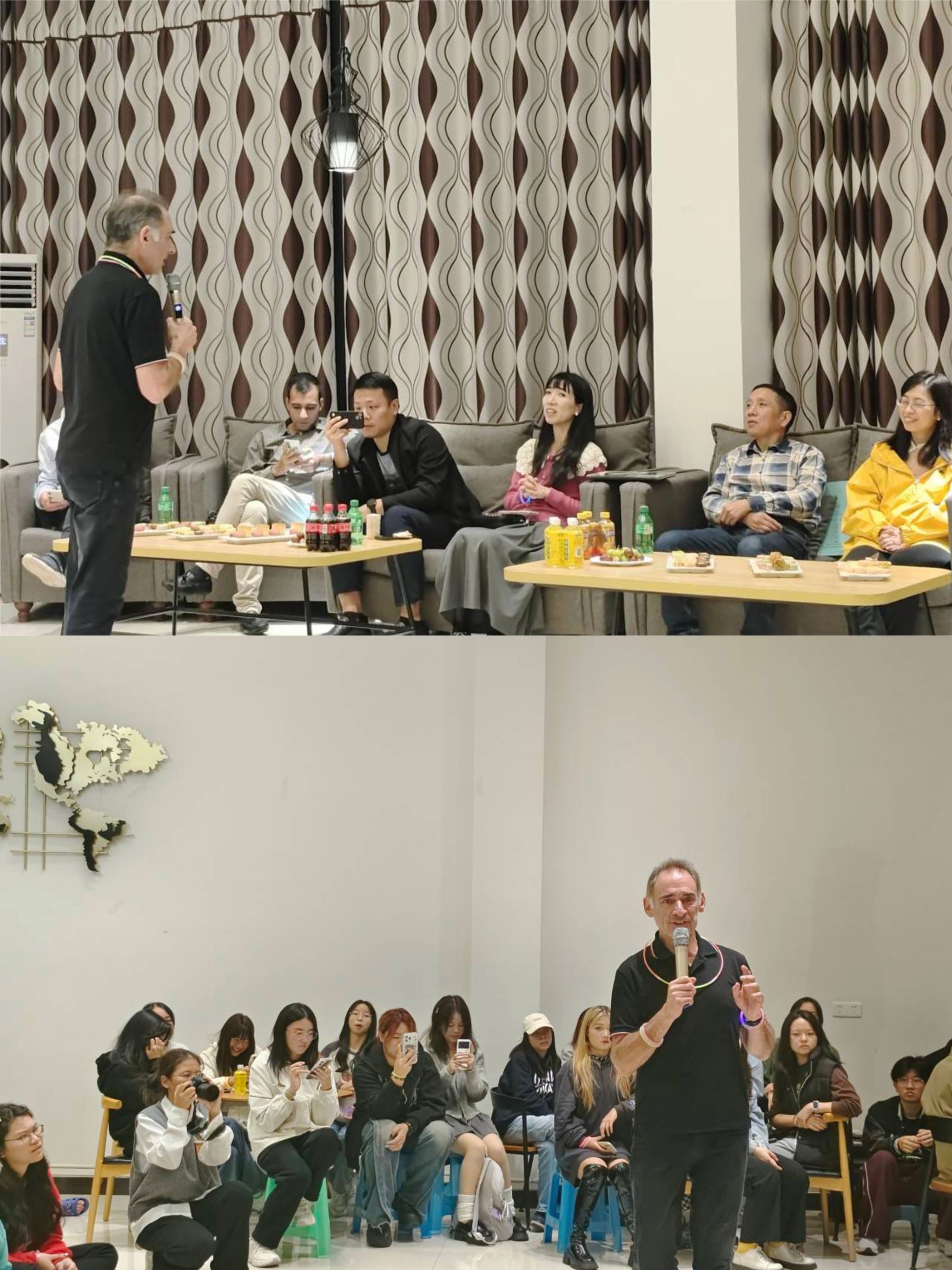 随后,在热烈的掌声当中,Clive分享自己来到中国的种种经历、与同学们相处的点点滴滴。他提到,原本从事于医疗研究领域的他,研究药物,但受中国优秀文化吸引,遂动身来到中国。赏名胜、结好友、品美食、学汉字——这成为他生活的一部分。在游历过程当中,深切体会到来自中国人的热情。十年的外教生涯已让他深深扎根在中国,他鼓励同学们要勇于尝试用英语进行交流,并告诉同学们,要相信自己的潜力,相互学习,相互成长,同时对学校一直以来的关心和支持表示感谢。Clive既是良师,也是益友。