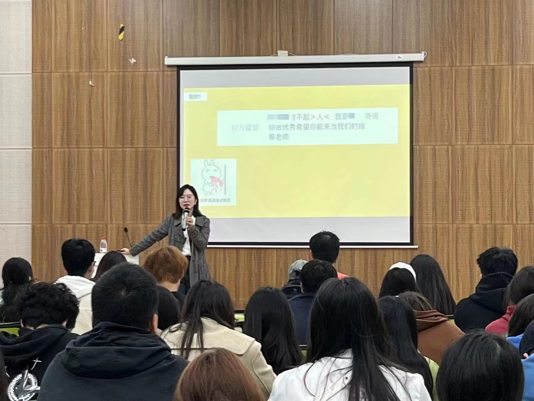 说话是一门艺术,也是架起沟通桥梁的开始。在主持人的带领下,一场与“沟通”的思想碰撞正式拉开序幕。活动伊始,隋慕驰老师以向大家提出问题为线,提出“在你眼里的沟通是怎样的?”,再抛出以“部长竞选”的场景分析题,让同学们带入自己的思考,引发他们的感受。随后,隋老师以亲身经历,向同学们分享她的故事,并耐心的为大家解释,提出当你遇见这种情况应该以一种什么样的方式去回答,并强调在沟通时,希望大家能明确沟通双方的地位,有求于人要谦虚对待,把选择权交给对方,创造舒适的交流氛围,逐渐提升社交能力。