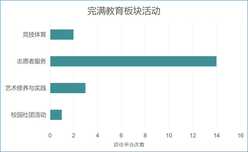 外国语学院完满教育活动中,活动参与次数达2335次。完满教育旨在完满、全面发展。由本月数据可见,外国语学院的小伙伴们在各方面发展比较健全。