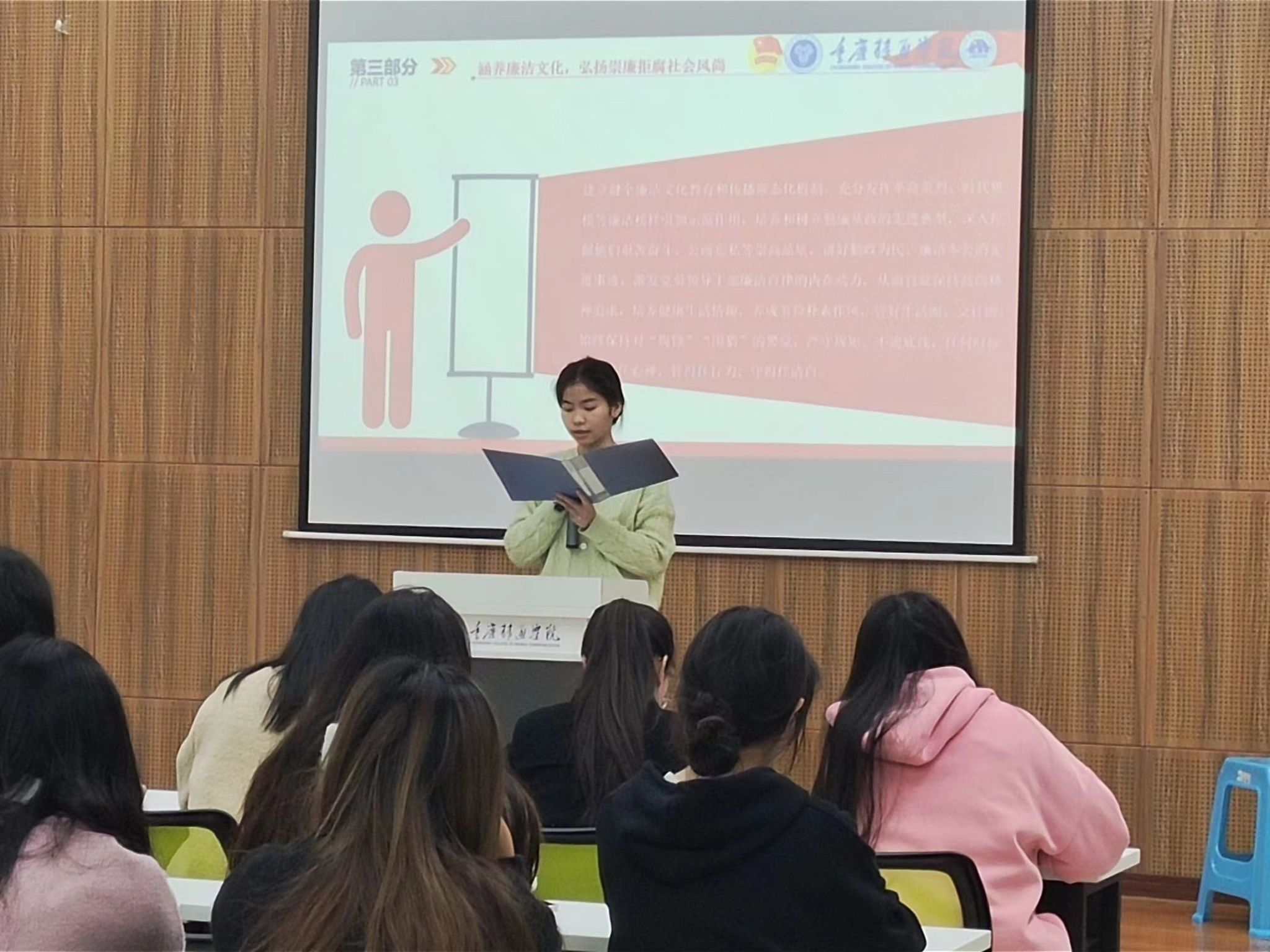 为深入学习习近平总书记关于党风廉政建设、廉洁文化建设的重要论述和对广大青年的殷切希望,提高学生的清廉思想意识,强化学生理论武装思想,提高外国语学院全体思想素质,特外国语学院团总支组织部于11月13日中午12:20,在天渠111报告厅成功举办强化理论武装,树“青”廉 活动。
