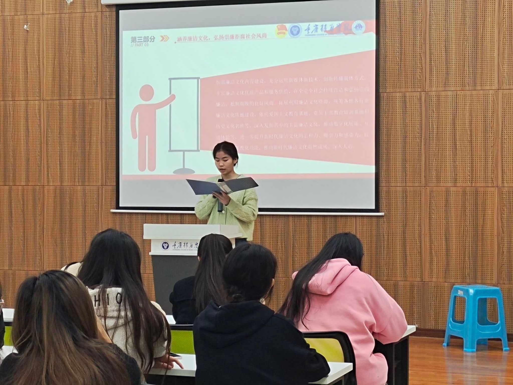 培训伊始,外国语学院团总支学生副书记夏彩琳带头领学了《重庆市青年干部“六查六问”教育活动深化“青春倡廉”行动工作方案》文件精神,呼吁在座各位共青团员和学生干部,作为同学们学习的榜样,要保证自身廉洁,应以“廉洁自律、勤俭务实、诚实守信、自律自强”为要求,扣好人生的第一粒扣子,志存高远,坚定信念。