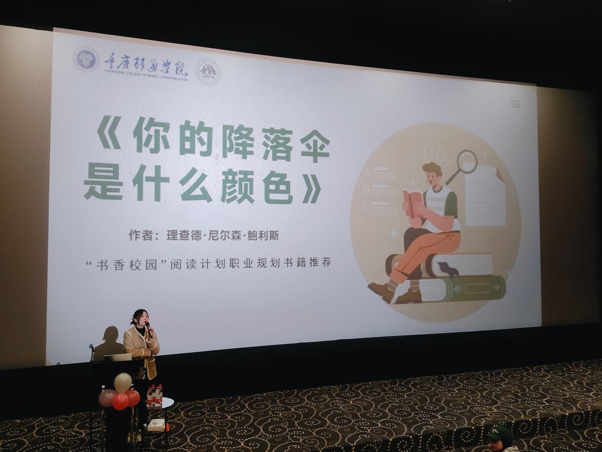 “最是书香能致远”,为让大家更贴近职场,用理论武装头脑,2021级英语1-6班11月份主题年级会也结合了本次书香活动开展。辅导员屠建丽老师为我们推荐了书籍《你的降落伞是什么颜色》,希望我们能更加全面认识自己,明确自身优势和理想中的工作境况,知道自己喜欢的知识或感兴趣的领域,了解自己拥有的可迁移能力,同时以自己的考研经历分析让我们学会确定自己的目标并为之努力。