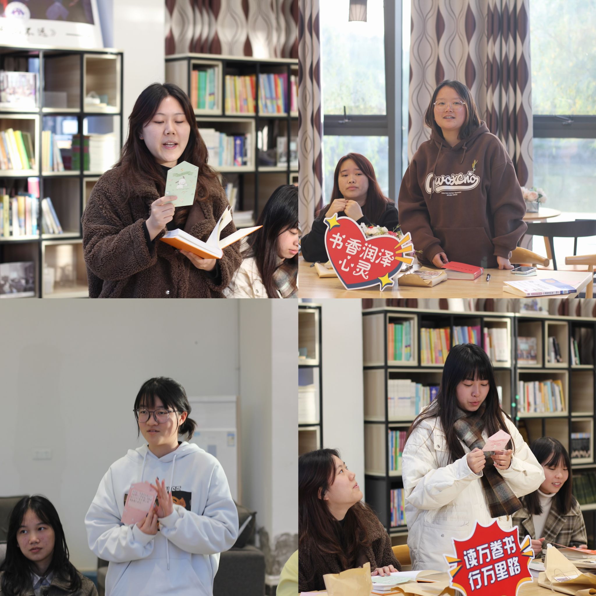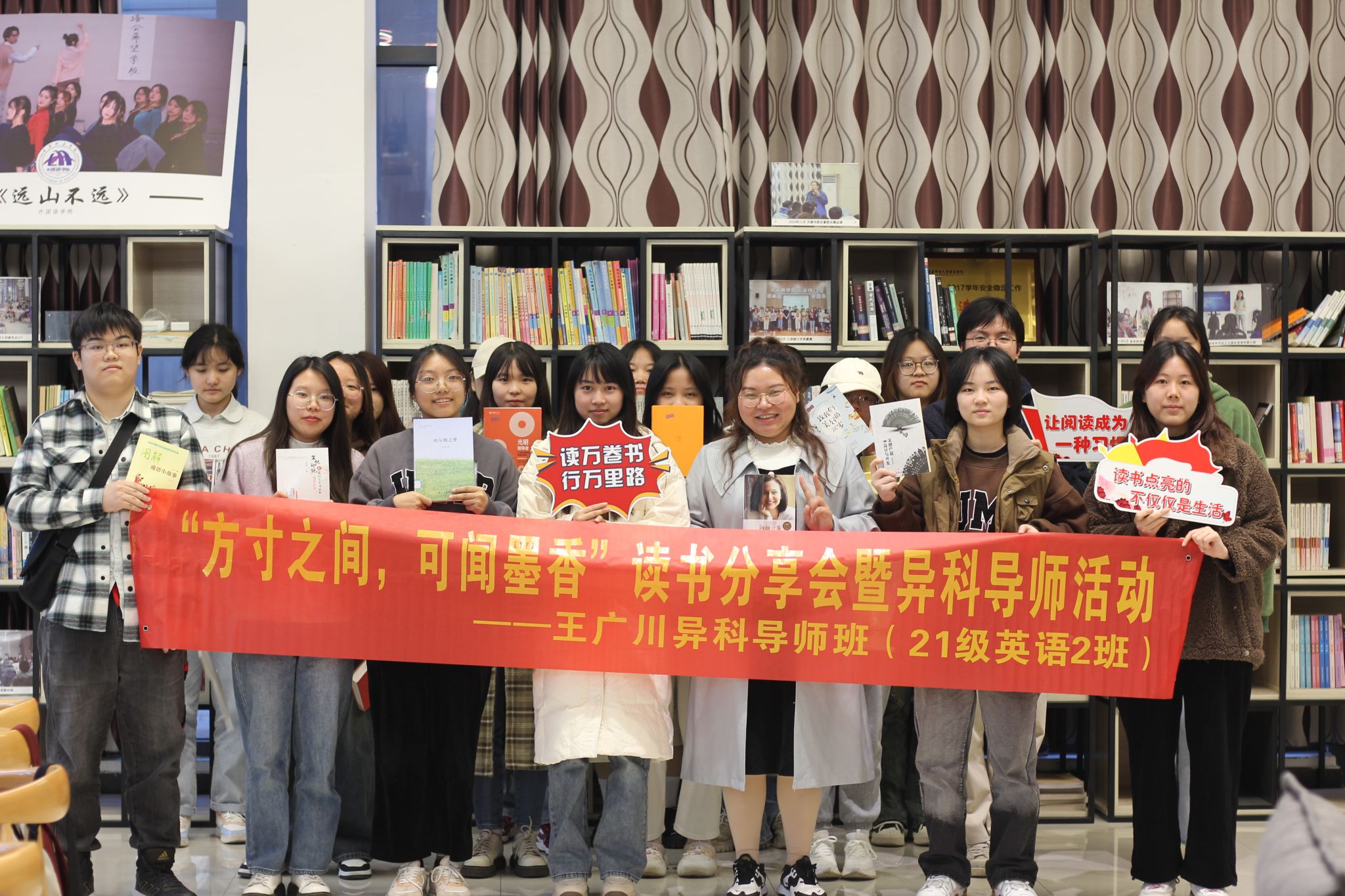 碧空如洗,阳光恣意。在这暖暖的初冬,赴一场冬日读书会,共沐书香。为营造积极向上、清新高雅、健康文明的校园文化氛围,激发同学读书的兴趣,2021级英语2班开展了一系列读书活动,让同学们在读书中感受学习的快乐,体验成长的乐趣,不断提升自我阅读品位,养成良好的读书习惯。此次主题活动大约借书300本,平均每日打卡30人次,共开展4次小型个人读书分享会,3次大型读书会等一系列活动。