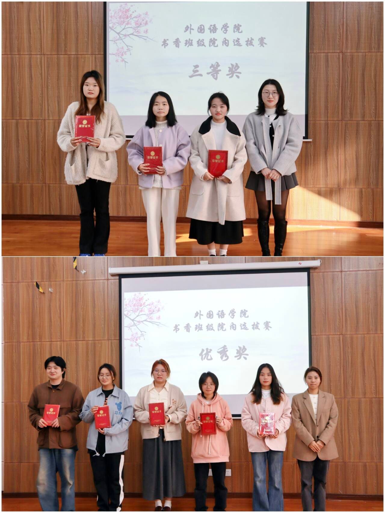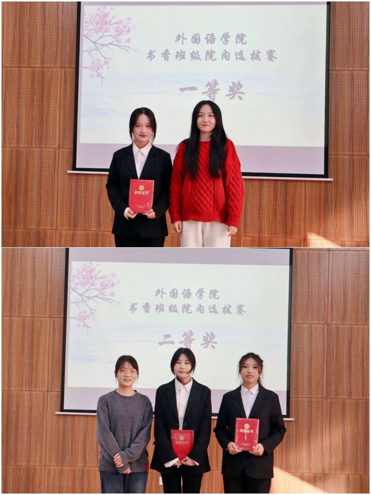 荣获本此外国语学院书香班级PK大赛一等奖的是——2022级英语6班,二等奖——2021级英语2班和2022级英语11班,三等奖——2021级英语10班、2022级英语9班以及2023级英语3班,优秀奖——2022级英语1班、2023级英语6班、2023级英语8班、2023级德语1班以及2023级德语2班。