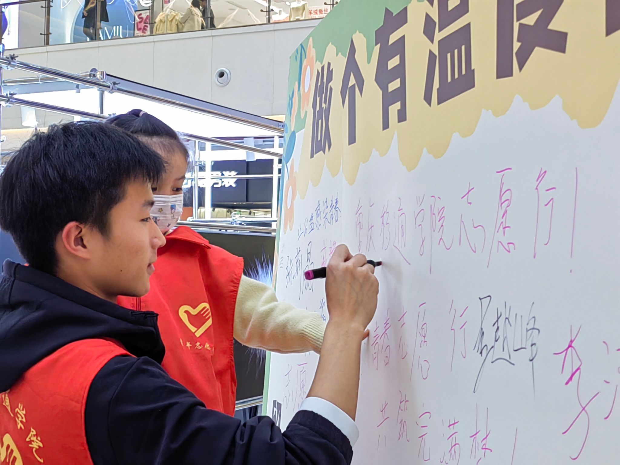 由我校青年志愿者联合会、外国语学院青年志愿者协会的志愿者代表带来的合唱《志愿者之歌》,点燃了在场的所有观众朋友,志愿者与小朋友的暖心互动吸引了更多市民朋友驻足公益地摊旁。现场的留言墙上,都是市民朋友们为少年儿童留下的暖心寄语。