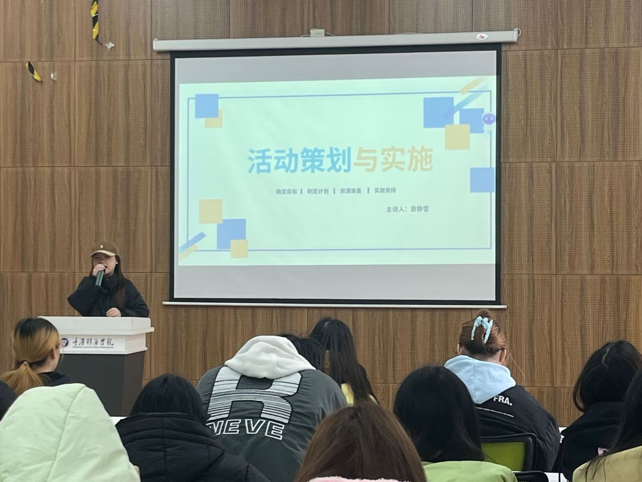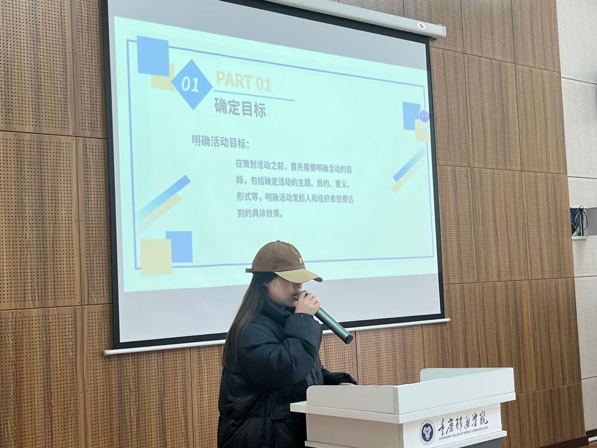 紧接着,曾学姐从活动策划为大家进行讲解。策划活动需要考虑各种资源的配备和预算,以确保活动的顺利进行并取得成功。在策划过程中,需要充分考虑场地、设备、人力和物资等资源的配备情况,并制定合理的预算,以确保活动能够有序进行。同时分享自身经历,让大家更好地理解如何在实际工作中运用所学知识。