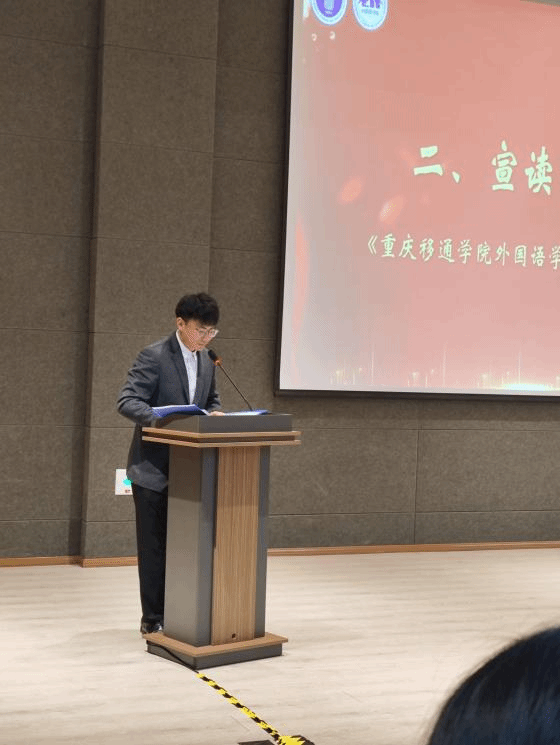 新征程,新起点,2023年12月9日下午两点,外国语学院校友会成立大会拉开新篇章,校友们通过观看“追忆母校旧貌,探移通新风采”宣传视频,回顾移通学院的变迁。外国语学院就创办主任阳果老师宣读《重庆移通学院外国语学院校友会章程》,为校友会提供制度保障。外国语学院吴世银院长宣读外国语学院第一届校友会候选人提名名单,宣布校友会的正式成立。随之,礼仪呈上聘书,由吴世银院长,马喆副院长,团总支书记吕戈老师,阳果老师分别为会长、副会长、理事等颁发聘书,校友们接过聘书,聚力向前,传递薪火。