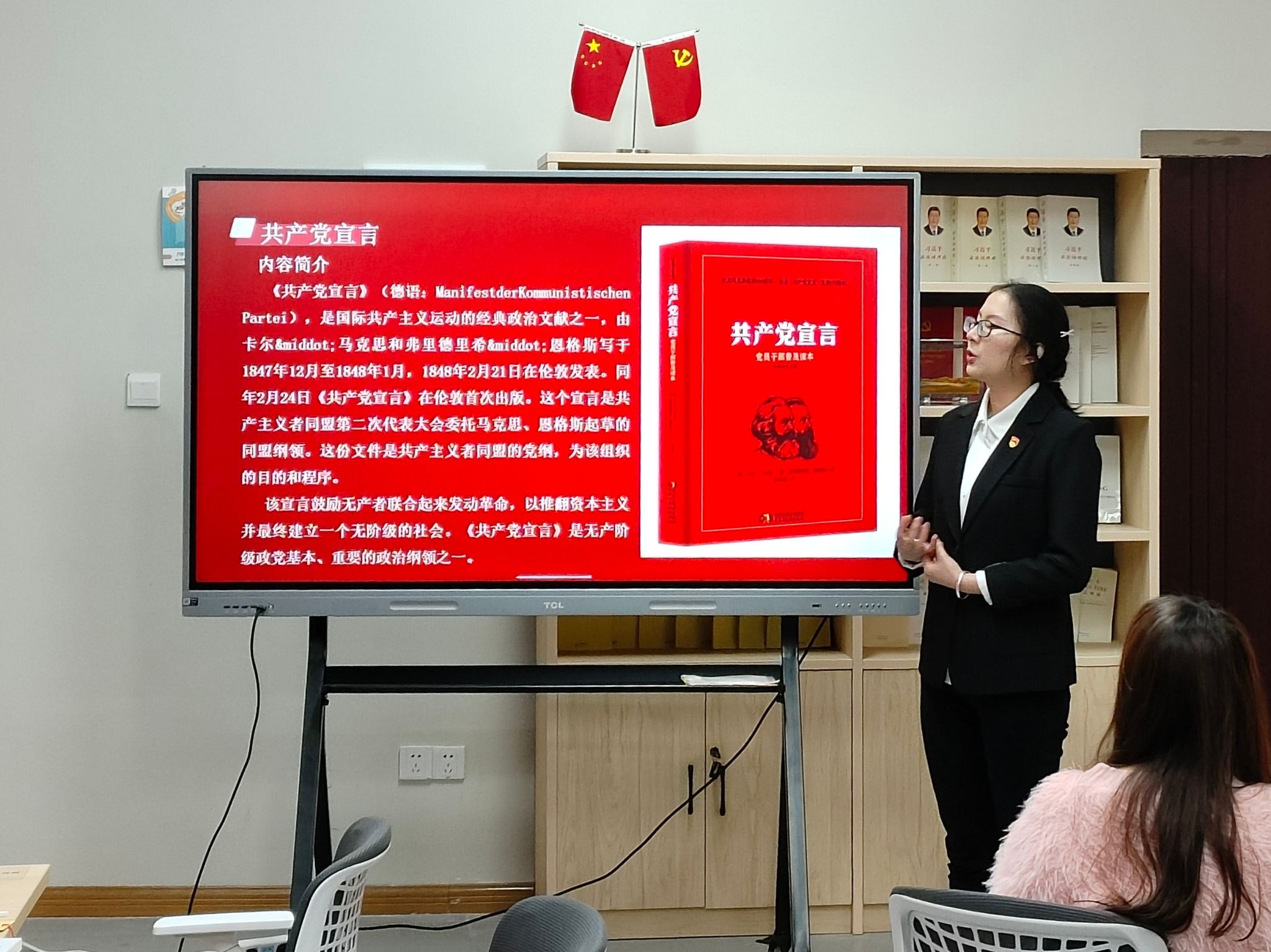 活动伊始,第四组的党员同志为本次读书会的部分书籍进行了一个简单介绍。首先介绍的是《共产党宣言》,这是一本由马克思恩格斯共同创作的优秀做品,至今影响着每一个共产党人;其次通过一本记录2017年以来习近平总书记在各个场合讲述的精彩故事合集《习近平讲故事》,从六个维度切实感受到习近平新时代中国特色社会主义思想的博大精深和无穷魅力。回望历史,中国共产党走过的挫折泥泞,最终凝聚成《百炼成钢》——中国共产党应对重大困难风险的历史经验。除了历史经验,中国乡土传统文化和社会结构理论的研究同样在《乡土中国》一书中得到了最全面的解释。文化的传承,更需要梦想的加持,《旗帜的力量》回顾了中国共产党领导中国人民逐梦太空的奋斗历程;在2012-2022《新时代这十年》中,从十五个方面展示了党从十八大到党的二十大这十年取得的原创性思想,变革性实践,突破性进展和标志性成果。每一本书都值得所有党员同志慢慢品读,用心感悟。