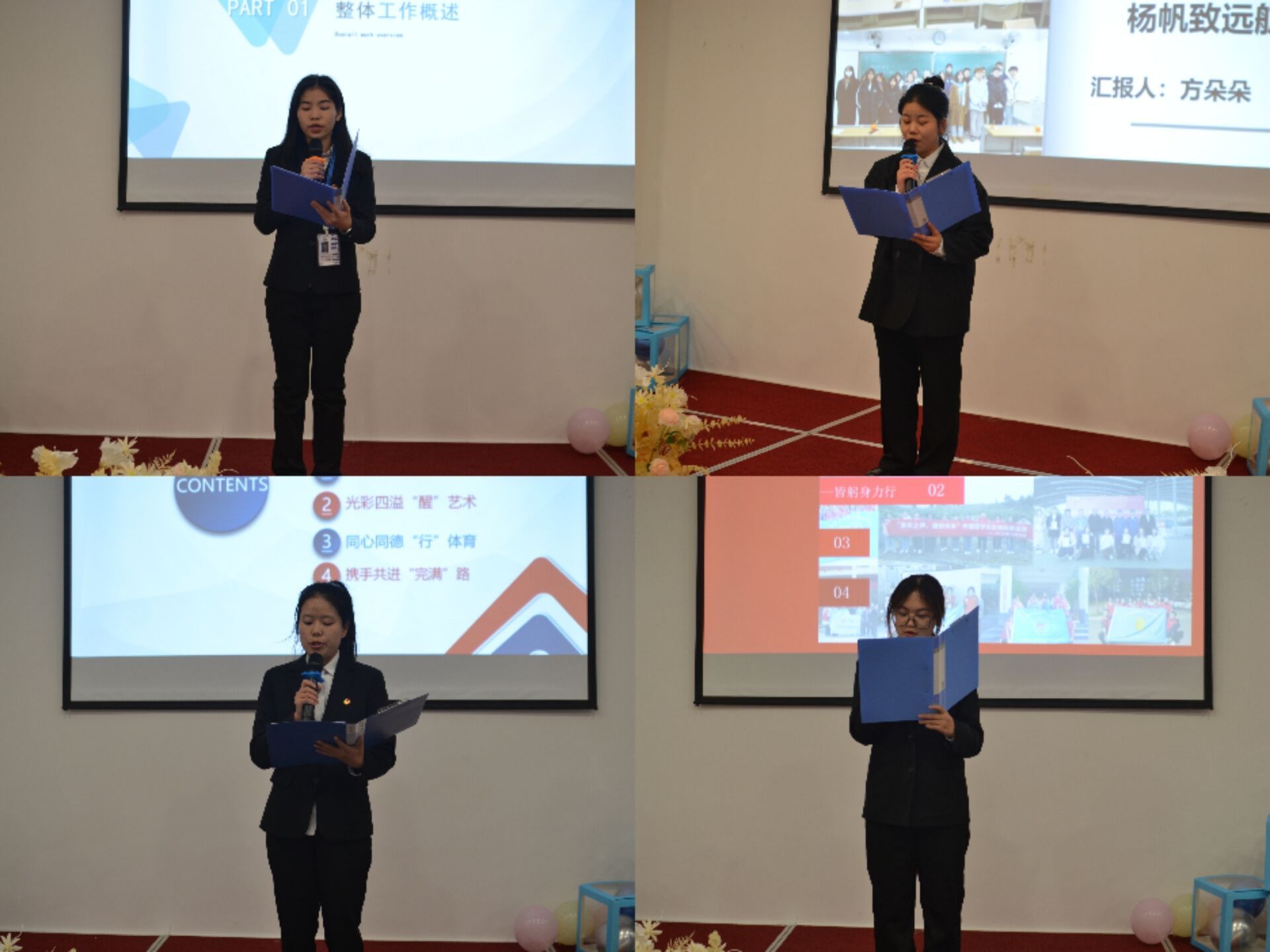 时光不弃青栀,流年不改初衷。以过往为引,在坚守职位中画下学期句点,于无声处凝聚蓬勃力量,首先,由第四届第一任学生组织主席团代表依次进行学期工作总结,他们总结本学期的工作内容、归纳不足、展望未来,并提出大家在学习和生活中应该坚持不懈努力奋斗,共同书写完满新篇章。聚是一团火,照亮完满之路,接着,由第四届第一任学生组织各部门代表依次总结本学期部门工作的成就、优缺点及未来展望,干部干事在工作中有众多的亮点值得学习,这是对他们的赞赏更是对我们的激励。旧时光与新岁月更替,青涩与成熟交相辉映,过往与未来也将携手并进,望所有学生组织成员都能不忘初心,砥砺前行。