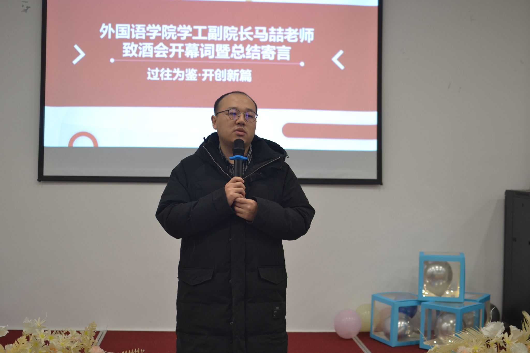 活动接近尾声,由外国语学院副院长马喆老师致酒会开幕词暨总结寄语,马喆老师首先对学生组织全体成员本学期的辛勤付出表达感谢之情,随后也对干部、干事工作述职、开展的活动的成效进行肯定与建议,希望学生组织成员都能抓住每一次机会,站上舞台展示自己的风采。接着,马老师以“实践”为重点与大家畅谈,希望同学们能在实践中找到共情力,无论做什么事情,先共情自己才能共情他人。随后,马喆老师表示希望学生组织成员们,无论是干部还是干事,积极投身实践,去实践不断丰满、反省自己,在完满中实现自己。最后,马喆老师希望各个部门能在指导老师的带领下,凝聚成员力量,对部门新学期的工作进行科学性的规划,明晰部门规划,制定目标,达到完满新高度。