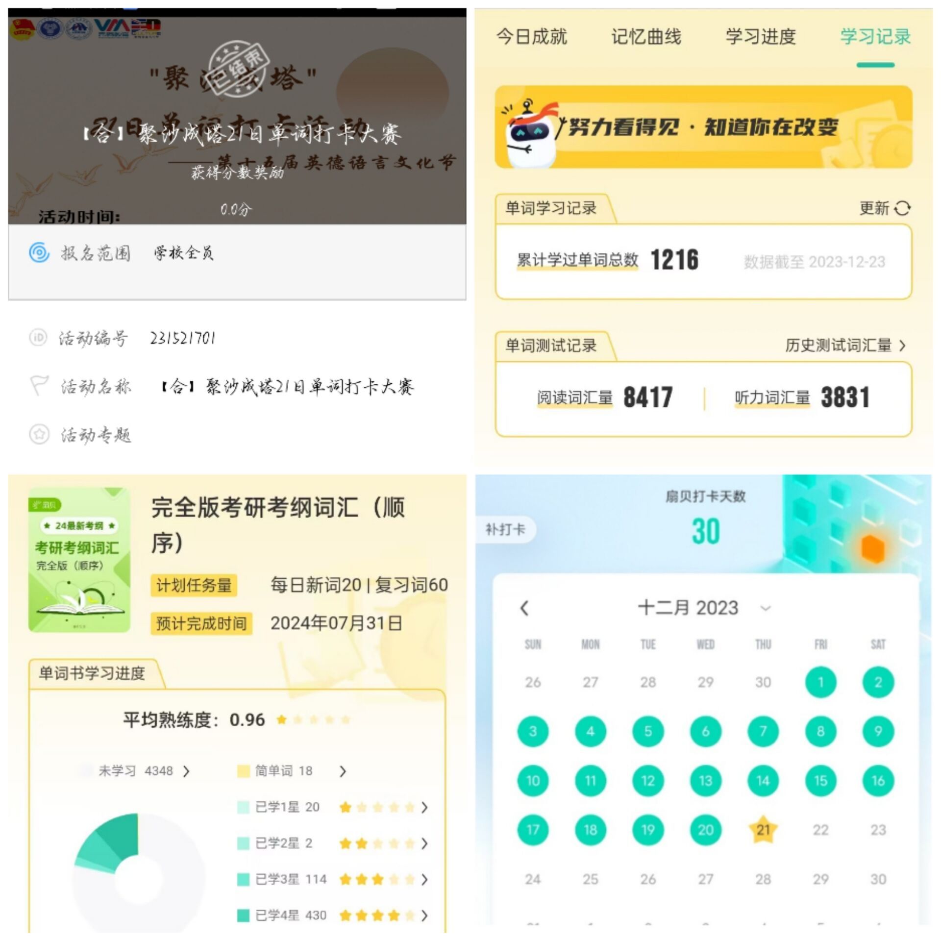 学无止境,生命不息。为激发同学们学习热情、积累更多词汇和养成良好学习习惯,一场别开生面的“聚沙成塔”21日单词打卡比赛在12月1日与同学们正式会面了。单词打卡比赛长达21日,在此期间,同学们充分利用课余时间积极地背诵单词,并在规定的时间内完成单词打卡任务。这展现出同学们坚持不懈的学习态度和高涨的学习热情,真正地做到了“心向往之,行必能至”的八字箴言。最后也祝愿同学们通过不断地学习积累,能构建出属于自己的知识塔,为未来的学习之路奠定坚实的基础。