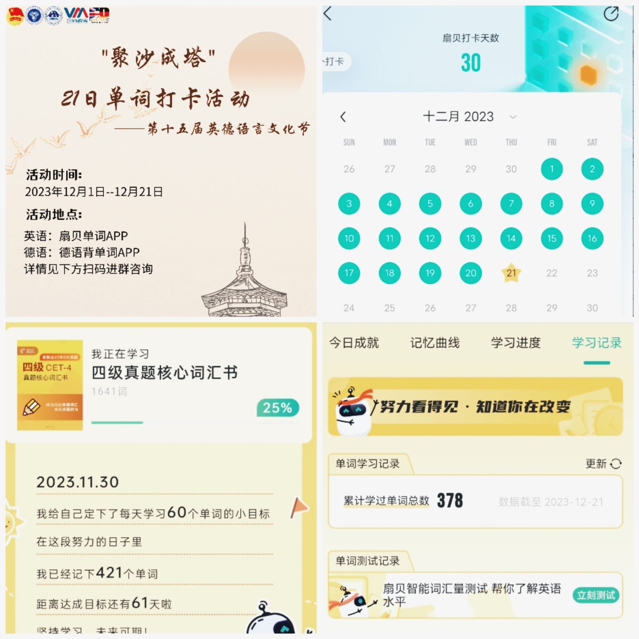 为切实加强外国语学院学风建设,培养同学们良好的学习习惯和诚信考试的学风风气,提高同学们对学习的兴趣。外国语学院十二月份学风建设主要围绕最美笔记活动、“聚沙成塔”21日单词打卡大赛和诚信考试宣传活动展开。希望同学们能书写出自己的芳华,在奋斗的路上步履不停。
