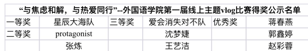 芳林新叶催陈叶,流水前波让后波。在各位参赛者们或各个参赛队伍提供的参赛作品中,看到了这个时代的青年们敢于打破常规,突破现有格局,敢于创新,走出一条“新”路。在经历了历时五天激烈的线上投票后,经过线上公众号投票得出的结果及排名,此次线上主题vlog比赛的结果如下: