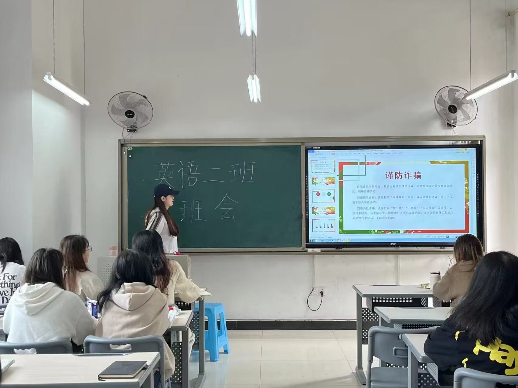 通过宣讲的形式,以身边人讲身边事,由学生带动学生,展现诈骗的相关手段以及防范措施。从真正意义上普诈骗知识,提高防诈骗意识,使其真正深入人心。由此,英语二班和四班开展班会,主题为“防止诈骗”,带领同学们了解诈骗类型和诈骗术语,以提高同学们的警惕。