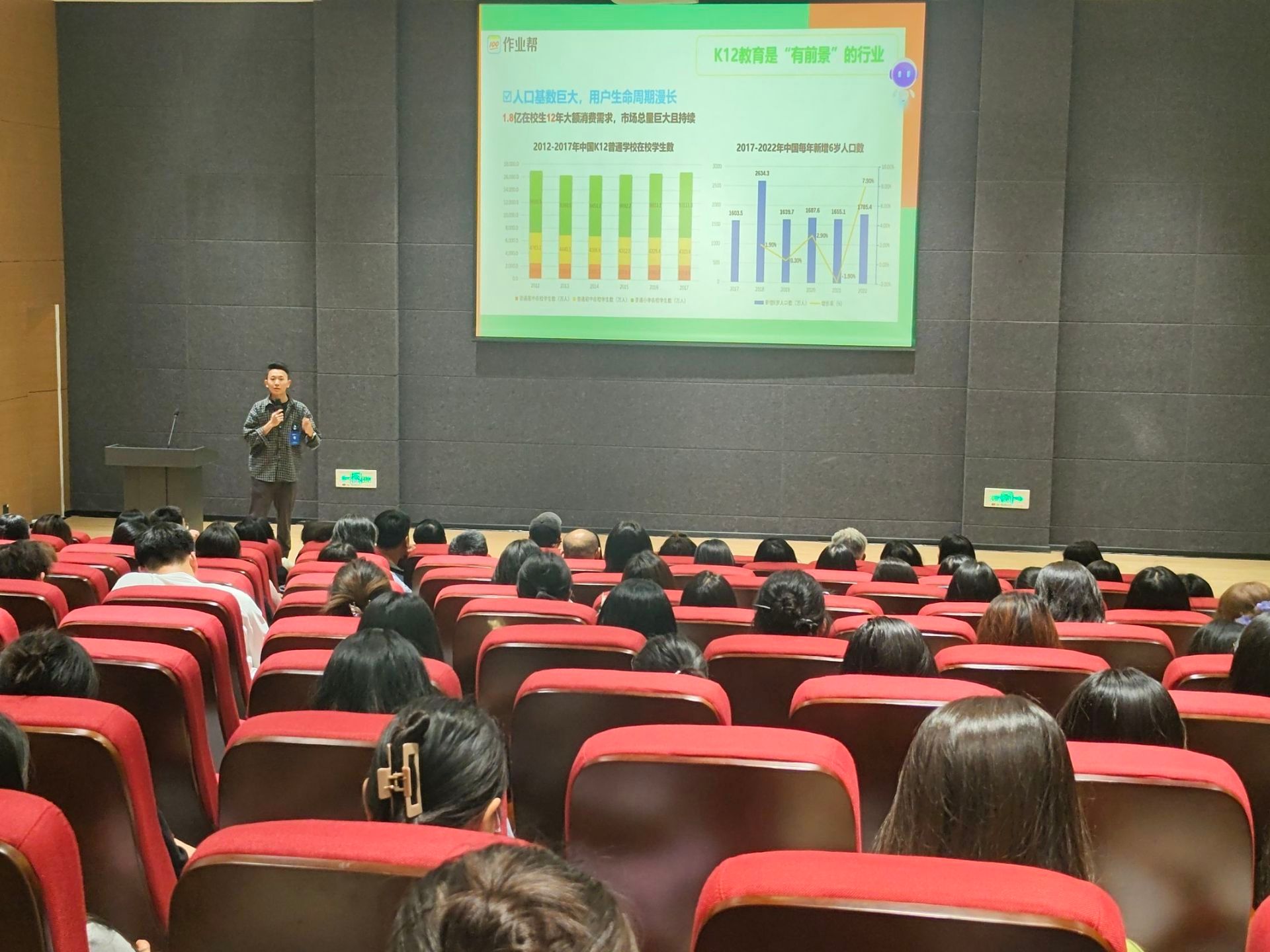 活动伊始,作业帮企业代表人刘其灵上台发言。刘老师向同学们详细介绍了当前的就业形势和市场需求,分享自身公司在招聘过程中的经验和要求。从作业帮企业的工具业务、硬件业务、素养业务和图书业务等六大业务方面,深入浅出的为同学们介绍企业环境条件和企业深厚独特文化。作为“独角兽”企业 ,作业帮负责人刘其灵老师为即将步入职场的毕业生提供了宝贵的就业信息,并深入剖析当前信息技术行业的发展态势和人才需求特点。全方位的为同学们介绍讲解现今社会需要什么样的“人才”。