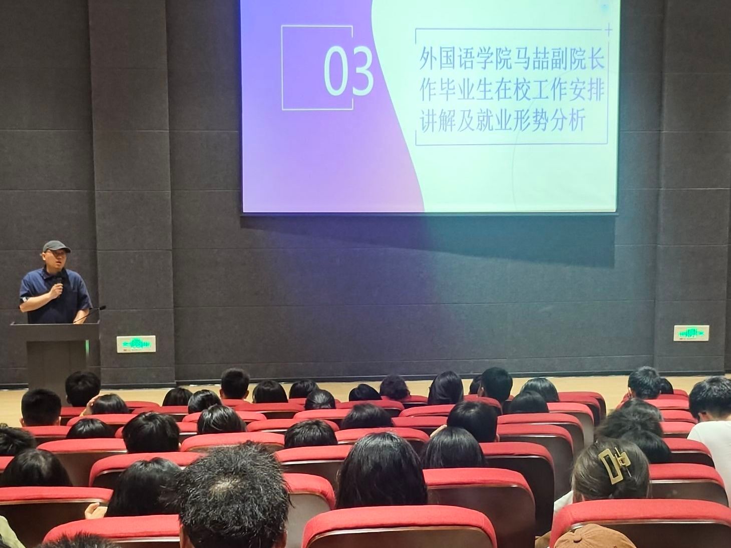 随着信息化时代的快速发展,各种各样的翻译器层出不穷,从而也导致语言类的岗位少之又少。面对“汤多肉少”的局面,外国语学院马喆副院长从现如今的就业市场整体走势分析,表示今年的毕业生人数较去年又上升了85万,预计2024年全国应届毕业生人数是1175万,就业形势不大乐观。接着对毕业生在校工作安排进行详细讲解,其中包括实习机会、就业指导服务等内容,并鼓励同学们积极面对就业挑战,把握机遇,充分利用学校提供的资源,提升自己的竞争力。与此同时,马老师强调大学毕业论文是大学生在完成本科学业过程中的一项重要学术任务,是对所学专业知识的综合运用与深度探究,同学们应当重视起来。