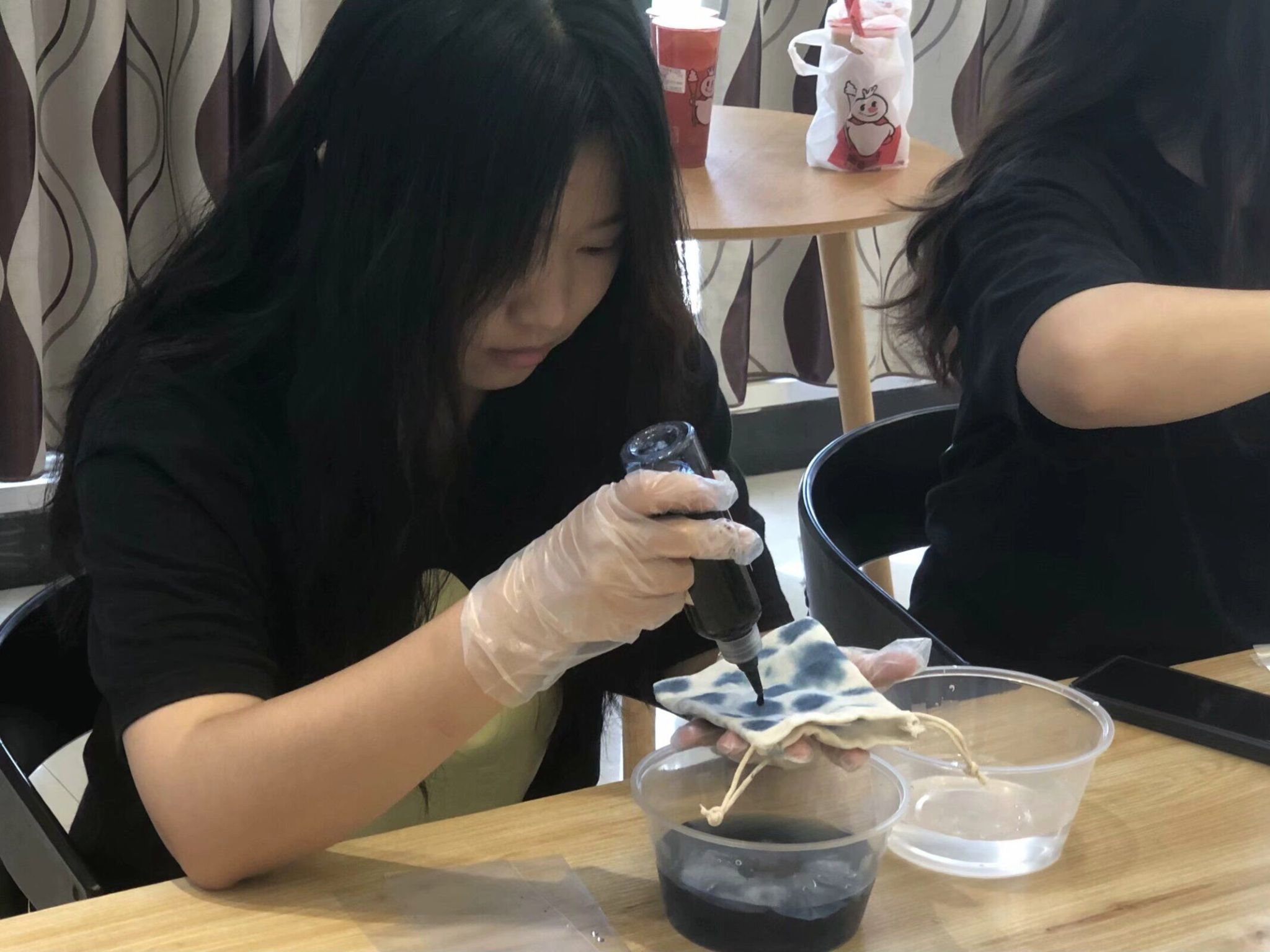 蓝色蓝于秋日,蓝色蓝于薪火。扎染,晕染千年的一抹蓝。当染料在布料上晕绕开来,白布上便有各种图样。经过主持人的讲解扎染步骤后,同学们通过浸、扎、染、晒四个部分使白布浸染上色,等待打开的过程像是和时间之间的一个博弈,凭着想象和创造,与结果做一个交换。在活动过程中,同学们不仅互相交流扎染技巧,还分享彼此的创作思路和心得。现场氛围热烈而欢快,所有情感都在此刻被具象化。