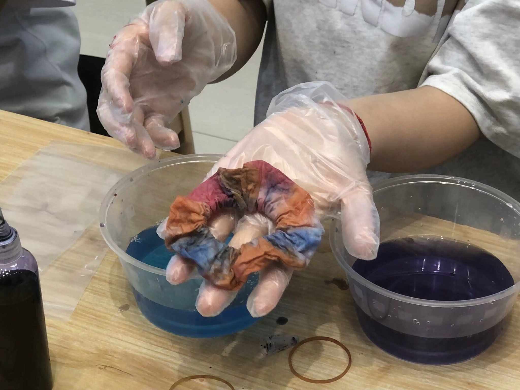 丝丝入扣结扎成,斑斓色彩染风情。当染色遇上融合,当传承遇上温暖,双手与扎染的碰撞,让传统与艺术共生共融,扎染出独一无二的“艺术品”。在扎染的过程中,同学们通过运用不同的技术和方法创造出独特的纹理和图案,扎染出独一无二的自然美学作品。色彩相间的图案中,晕染是民间艺术的传承;无序错乱的捆绑中,展现的是独一无二的创意。