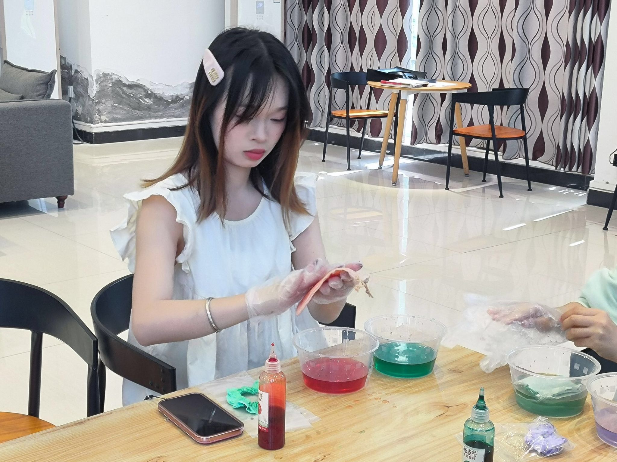 巧手扎锦绣,靛青染春秋。扎染,一种古老的民间工艺,与蜡染和镂空印花并称为我国古代三大印花技术,是中国传统的手工染色技术之一。在此次活动中,同学们仿若能工巧匠,研习扎染之技,充分感受传统手工艺的魅力,同时进一步了解了中华民族的优秀传统文化。扎染,能让参与者们感受历史在时代中的沉淀、激发起对传统文化的热爱与促进文化的多样性。