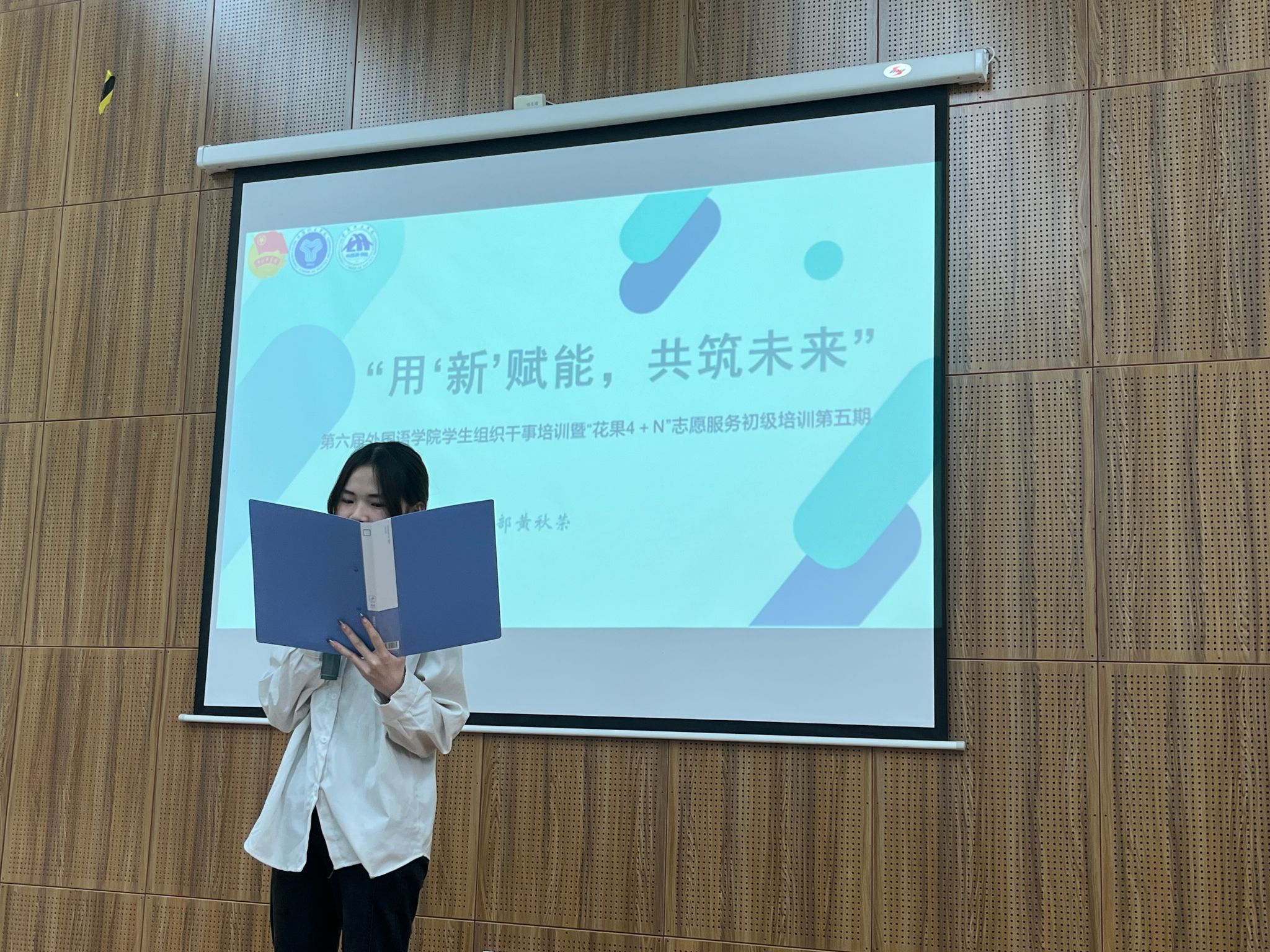 近日,一场别开生面的培训活动在外国语学院成功举办。此次培训活动以“用‘新’赋能·共筑未来”为主题,旨在进一步提升外国语学院学生组织干事的工作能力和志愿服务水平。活动不仅吸引了众多学子的积极参与,也标志着外国语学院在培养青年才俊、推动社会公益方面迈出了坚实的步伐。