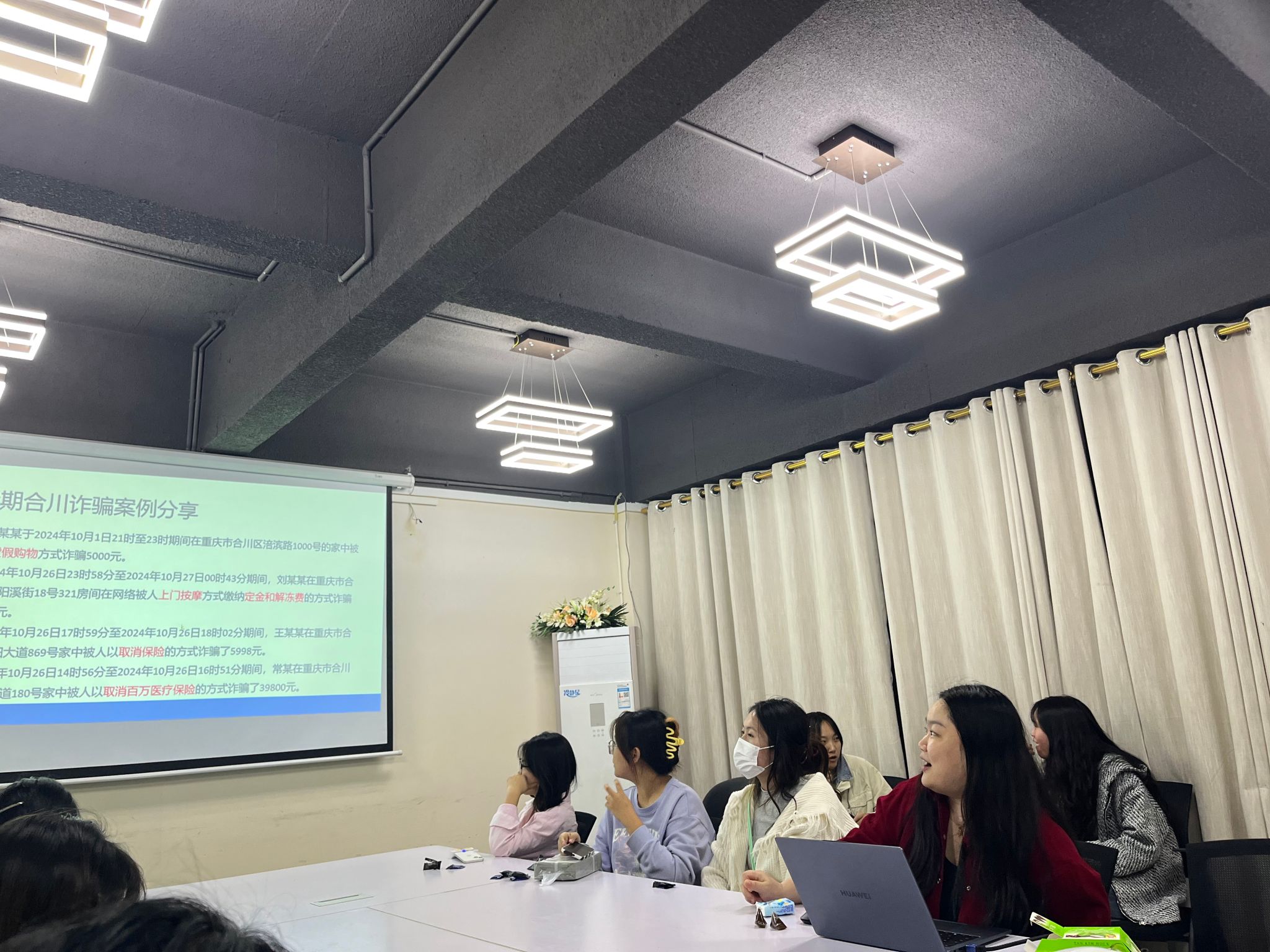近日,针对合川地区电信诈骗案件频发的情况,为提高大学生的反诈意识和自我保护能力,2024年10月29日晚,冯胜男老师在鱼城书院的头脑风暴会议室为2023级数字媒体艺术6、7、8班的异科学生举办了一场别开生面的反诈宣传活动。活动以“识破骗局·青春安全领航”为主题,旨在通过生动的案例分享和实用的防骗技巧,帮助学生们认清诈骗的本质,远离诈骗陷阱。