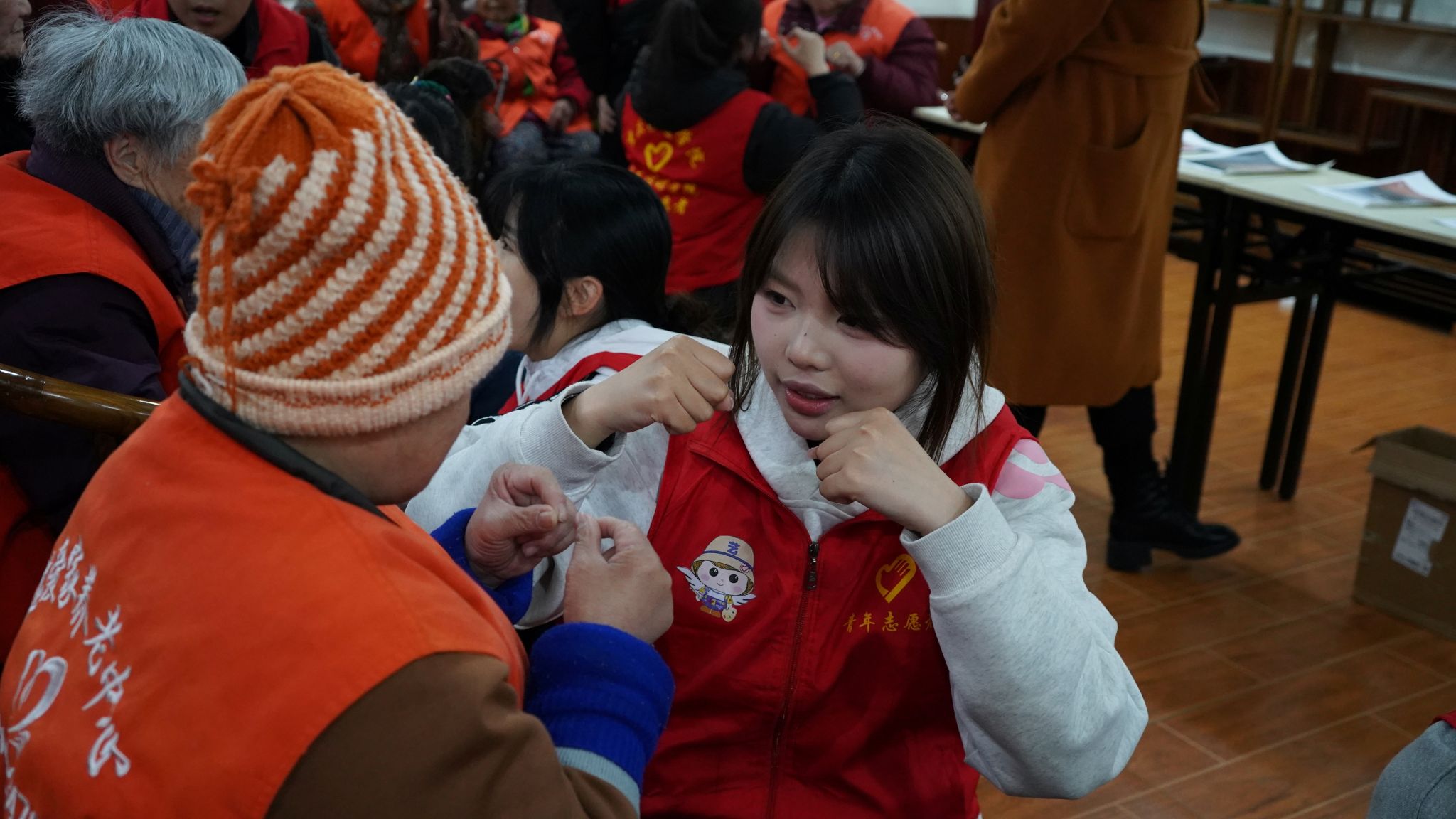 比划笑声起,高歌暖暮年。互动游戏环节将活动推向高潮。“手势舞”环节中,志愿者们生动形象的比划引得老人们开怀大笑,老人们也积极配合志愿者们完成舞蹈。到了老照片拼图环节,志愿者们悉心教导,将老物件呈现在他们面前。随后,志愿者们带领老人们一同歌唱经典老歌,从《强军战歌》到《打靶归来》,熟悉的旋律在房间里回荡,大家的歌声交织在一起,唱出了满满的幸福与感动。歌声停歇,志愿者们拿出精心准备的设备,为老人们拍摄证件红底照。他们细心地帮老人整理衣着、调整发型,在相机快门按下的瞬间,老人们脸上绽放出的灿烂笑容被永远定格。