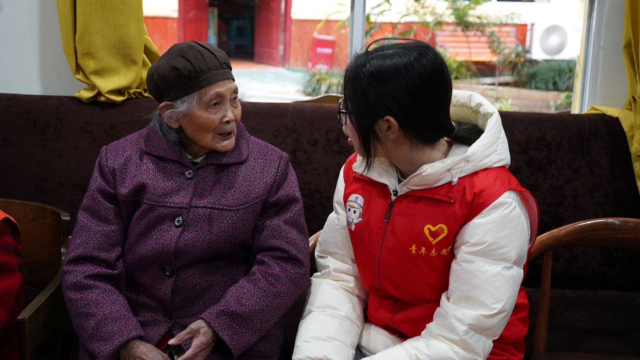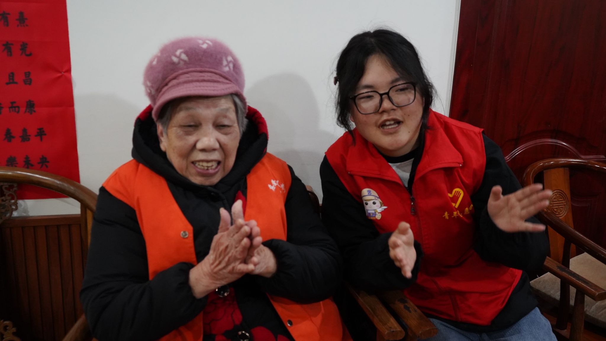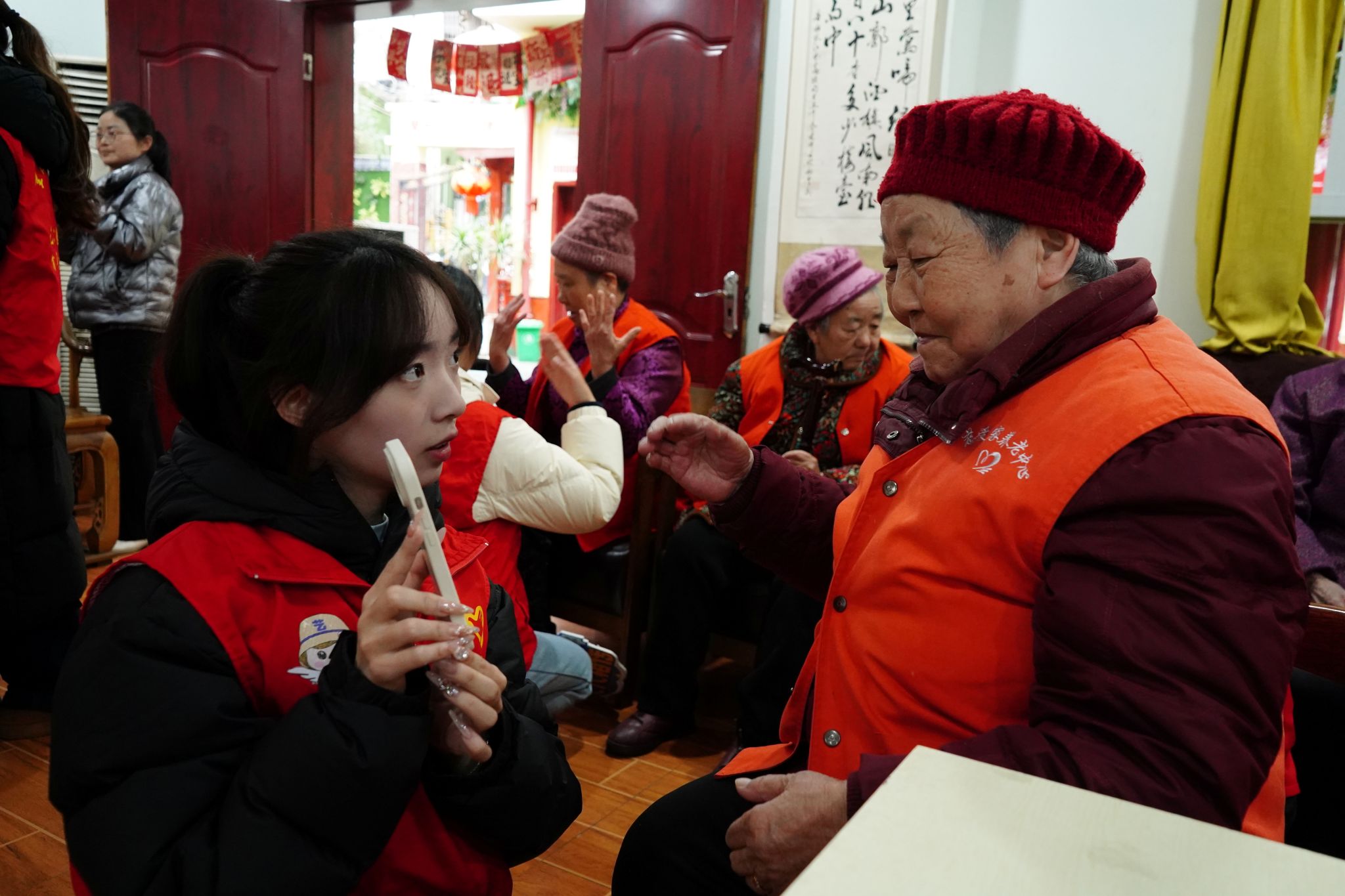 倾听奋斗史,老少情谊长。活动现场,志愿者们与老人们围坐在一起,开启了温馨的交谈。老人们缓缓讲述着年轻时的奋斗历程,那些艰苦却充满希望的岁月,以及生活中的点滴趣事,志愿者们都听得入神,时不时提问互动,现场气氛轻松而愉快。