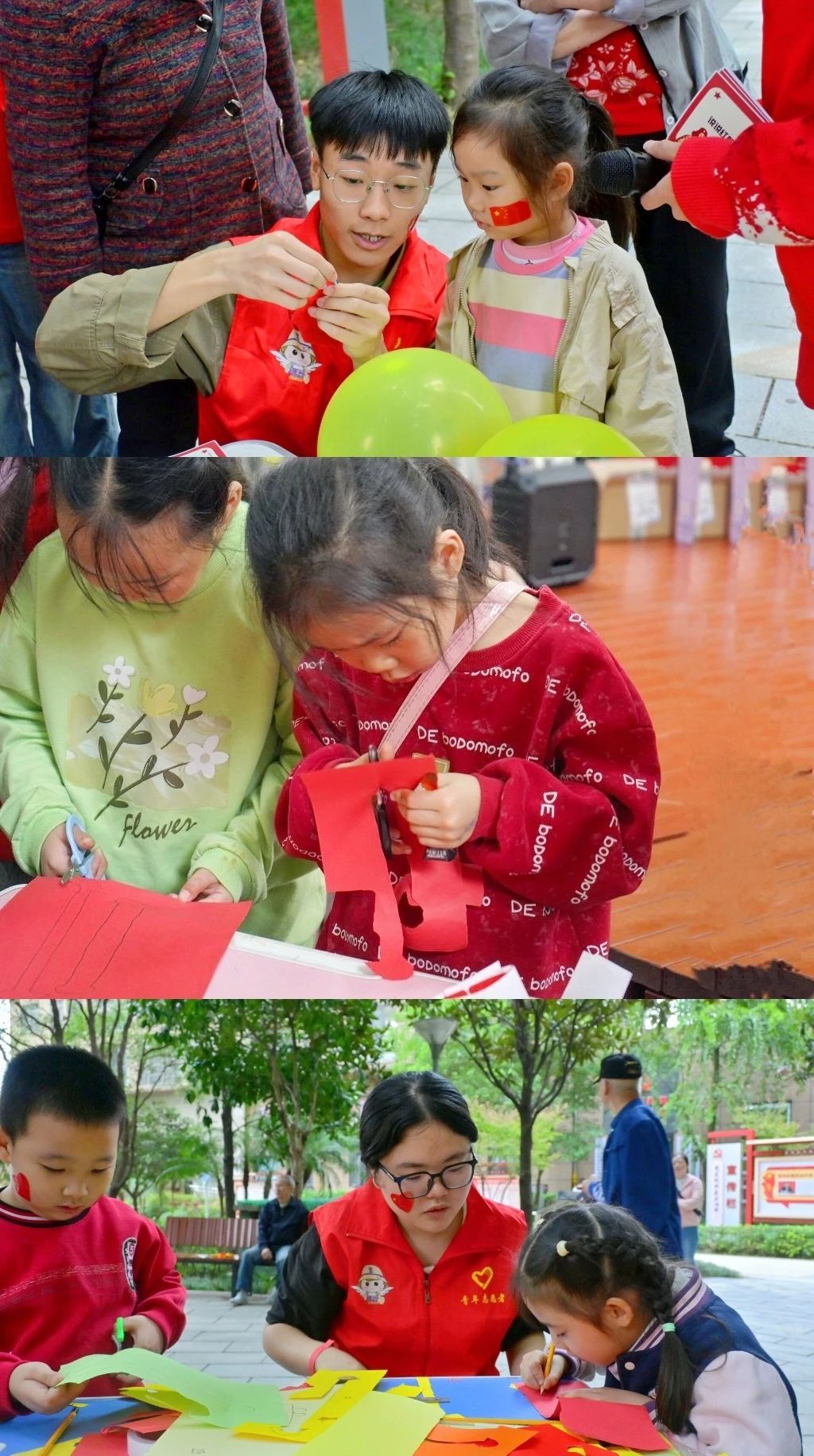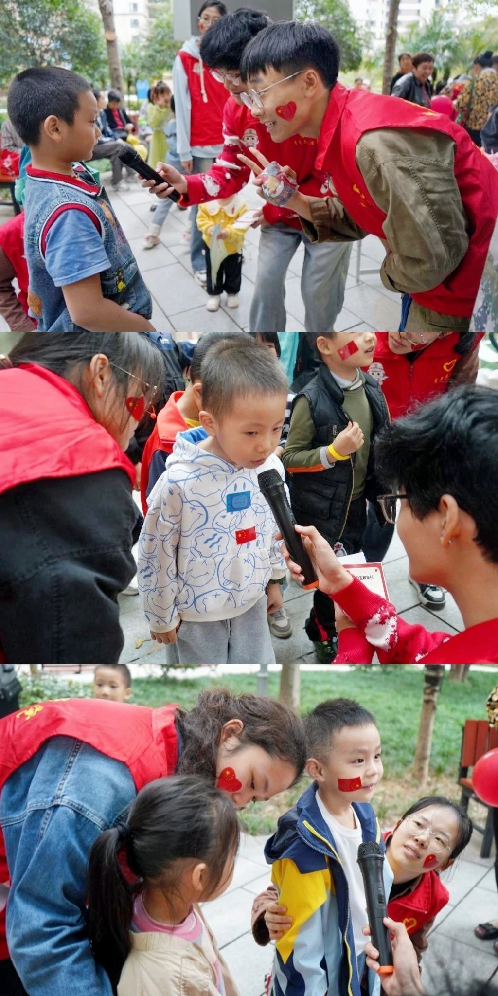 手工组的小朋友们拿着五颜六色的卡纸画上喜欢的手环图案,并由志愿者用剪刀裁剪出来为小朋友戴在手上。小朋友们他们发挥自己的想象力和创造力,全神贯注地投入到绘制旗帜当中,他们将手中的黏土变成了独一无二的作品。知识竞答组的志愿者每念出一道题目,便有小朋友们迅速高举小手,争着抢答。如遇到较困难的题目时,志愿者们则会给予提示,引导小朋友们思考。回答正确的小朋友来到扔沙包区域,累积一定分数可以换取对应的小奖品。活动现场充满了欢声笑语,气氛热烈而温馨。