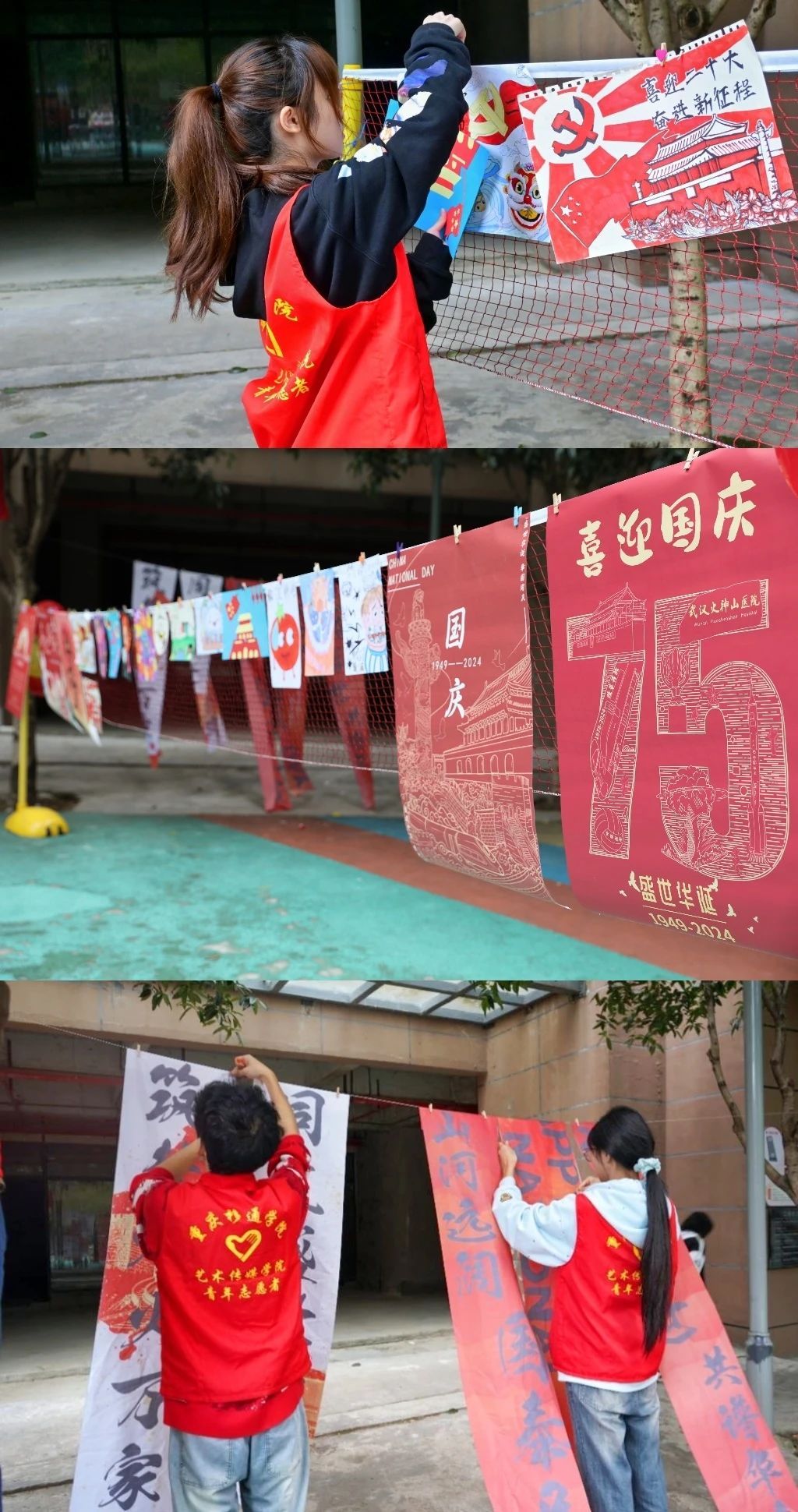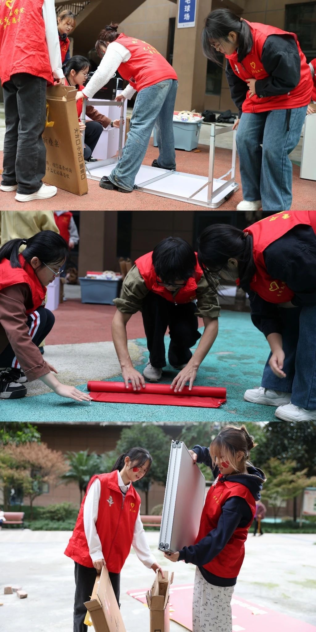 志愿手艺,为国添彩。活动前期,志愿者们精心地为小朋友们准备各种精美的手工礼物,并进行了相关培训。活动伊始,志愿者们合作分工布置活动现场,他们将往期作品有序地摆放在桌子、网架上展示,琳琅满目的作品瞬间吸引了许多小朋友的到来。同时志愿者们将打卡的宣传物料整理拼接,一幅中国地图的版型便逐渐成型,一场充满活力与爱心的盛会即将拉开帷幕。