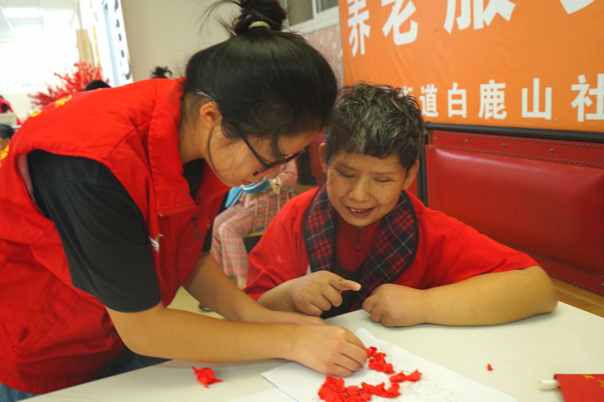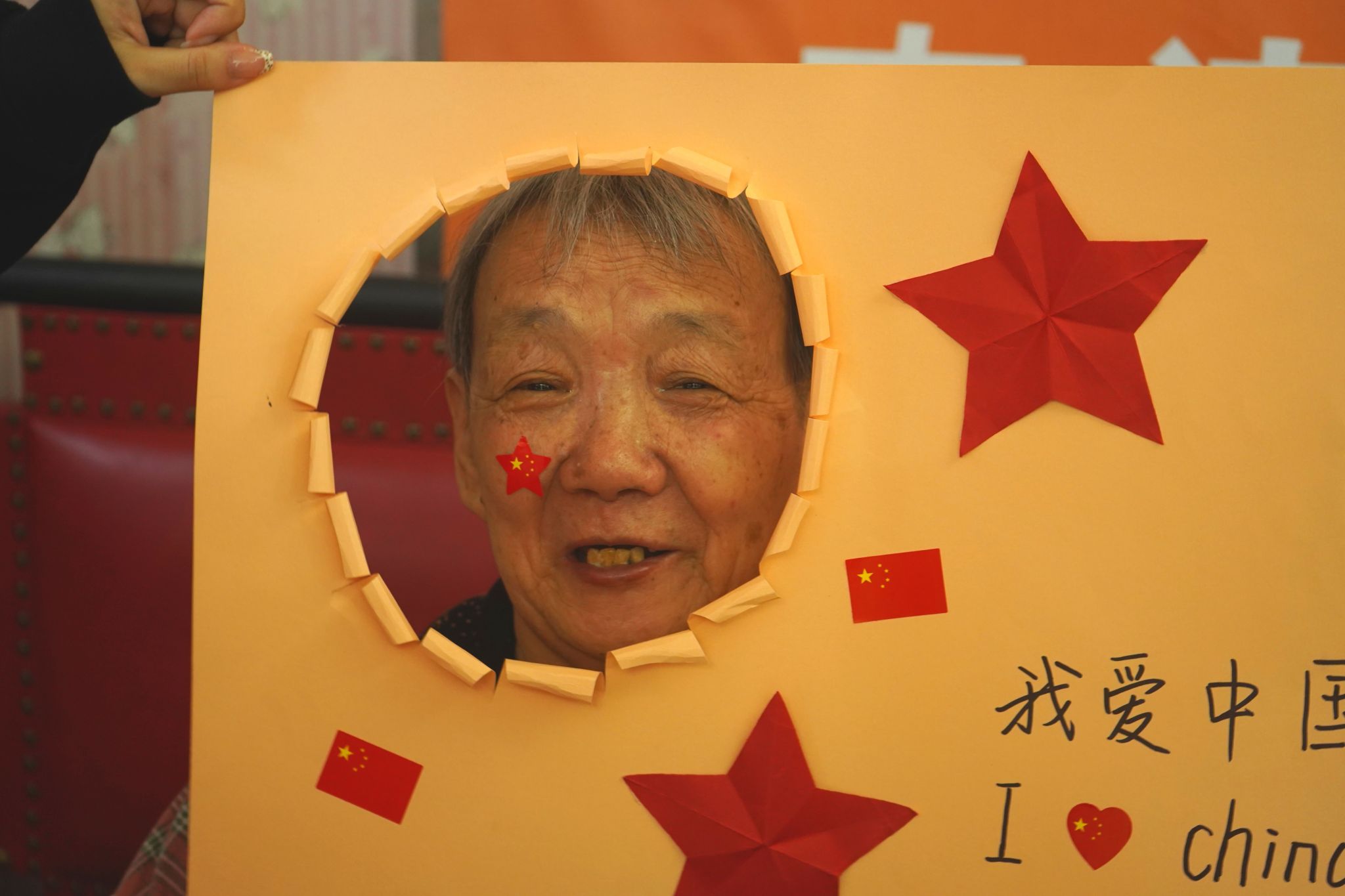 紧随其后的“制作卡纸国旗”环节同样精彩。志愿者围绕国旗设计规范展开细致讲解,讲解结束后,在志愿者的一对一协助下,老人们手持剪刀,仔细裁剪红色卡纸作为国旗底色,又精准剪出五颗明亮的黄色五角星,而后小心翼翼地将五角星粘贴到旗面指定位置。当一面面色彩鲜亮、象征国家尊严与荣耀的小国旗完整呈现时,老人们脸上绽放出自豪又幸福的笑容,眼神中满是对祖国的深厚情感与无限祝福。