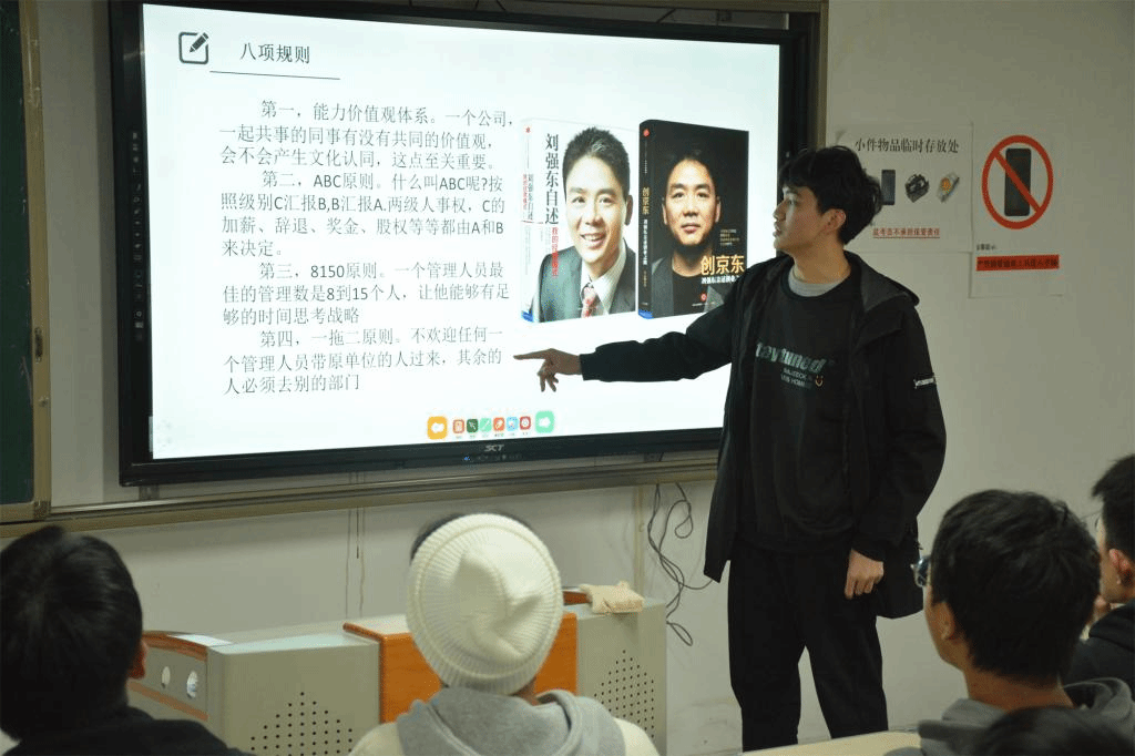 首先,学生会社团活动部部长杨林龙同学通过书籍《刘强东自述:我的经营模式》向干事们传递团队合作的重要性,同时他认为京东创始人刘强东的创业经历同样值得大学生们学习。学生会办公室主任刘涛则通过《一往无前》分享了雷军的创业故事,刘涛说道:“诚如雷军所言,追求极致是一种脚踏实地,少即是多的专注也是一种脚踏实地,因此既要有志存高远的豪情,也要有脚踏实地的理性;控制好节奏,保持前行,梦想就会照进现实。”