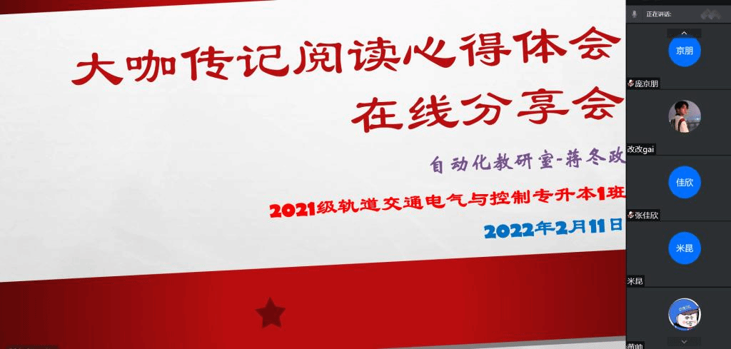 2022年2月11日,由智能工程学院轨道教研室蒋冬政老师,带领全体2021级轨道交通电气与控制专升本1班同学集中在腾讯会议,对阅读《腾讯传》的心得体会进行线上分享。同学们针对马化腾的创立腾讯帝国的创业过程畅所欲言,气氛异常活跃。