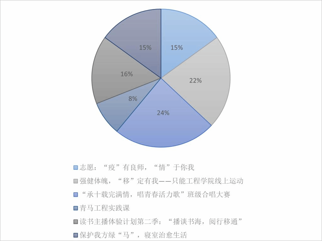截止至11月20日,智能工程学院共举办了七次线上活动,经过调研观察,我们评选出了最受同学们欢迎的活动:“承十载完满情,唱青春活力歌“班级合唱大赛。据不完全统计参与本项调研活动的同学占比44.74%,收到了许多同学的关注和喜爱。疫情虽然封锁了同学们的活动范围,但是同学们对生活的热情却没有受到限制。以下是本次调研活动的调研数据: