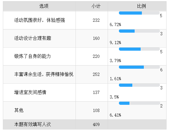 本次调研活动,不仅让同学们了解各种活动的举办形式,而且也让学院更加清楚同学们对各种活动的想法。同时感谢所有同学们的支持,每一次活动的目的是为了同学们更丰富多彩的校园生活,提升同学们的能力。疫情当下我们深知自己更需要将心情调到动感模式,为自己喜爱的活动献力,为爱冲锋。