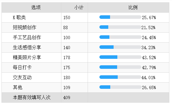对于未来的活动,同学们更希望分享自己丰富的校园生活。在本次调研活动中对未来的活动举办形式也进行了调查,不难看出大家对于可以展现于美物分享和交友互动活动有很大的兴趣。对组织者来说,合理开展丰富多彩又创新的活动也同样重要,下面我们调研了一些同学喜欢各类活动的人数。