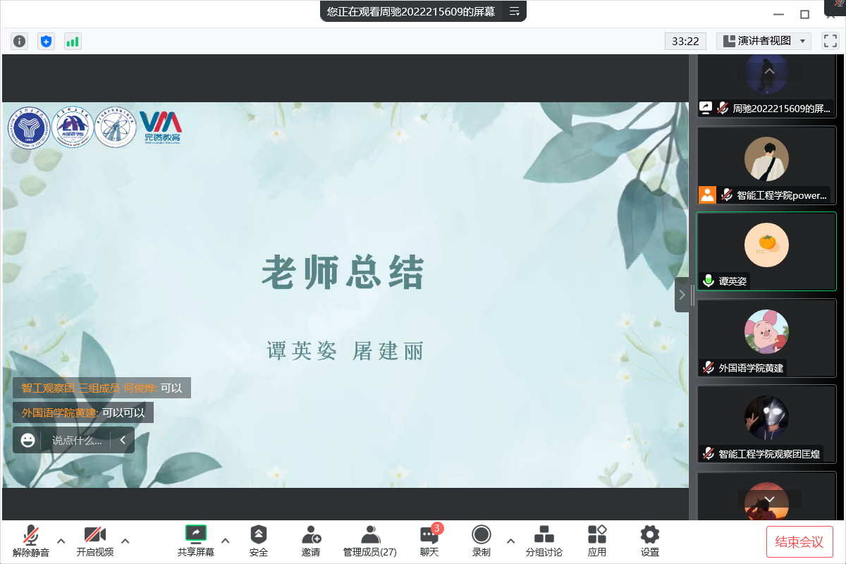最后,完满观察团指导老师进行了总结发言。智能工程学院Power完满观察团指导老师谭英姿老师指出牢固树立团队“一盘棋”意识,在疫情当下展望新程,既要迎难而上、攻坚克难,又要团结奋斗开启新篇章。外国语学院Starlight完满观察团指导老师屠建丽老师提到两院观察团的工作成就是有目共睹的,是值得肯定的。另外,她还建议观察团的团员们做好以下三点:第一,从模仿到升华。注意借鉴过往经验,在实践中探寻适合自己的道路。第二,不要拥有畏难情绪。在面对困难时学会多交流、多探讨,树立合作共赢观。第三,采访的问题要聚焦。要抓住主办方举办过程所遇的困难有针对性发问。