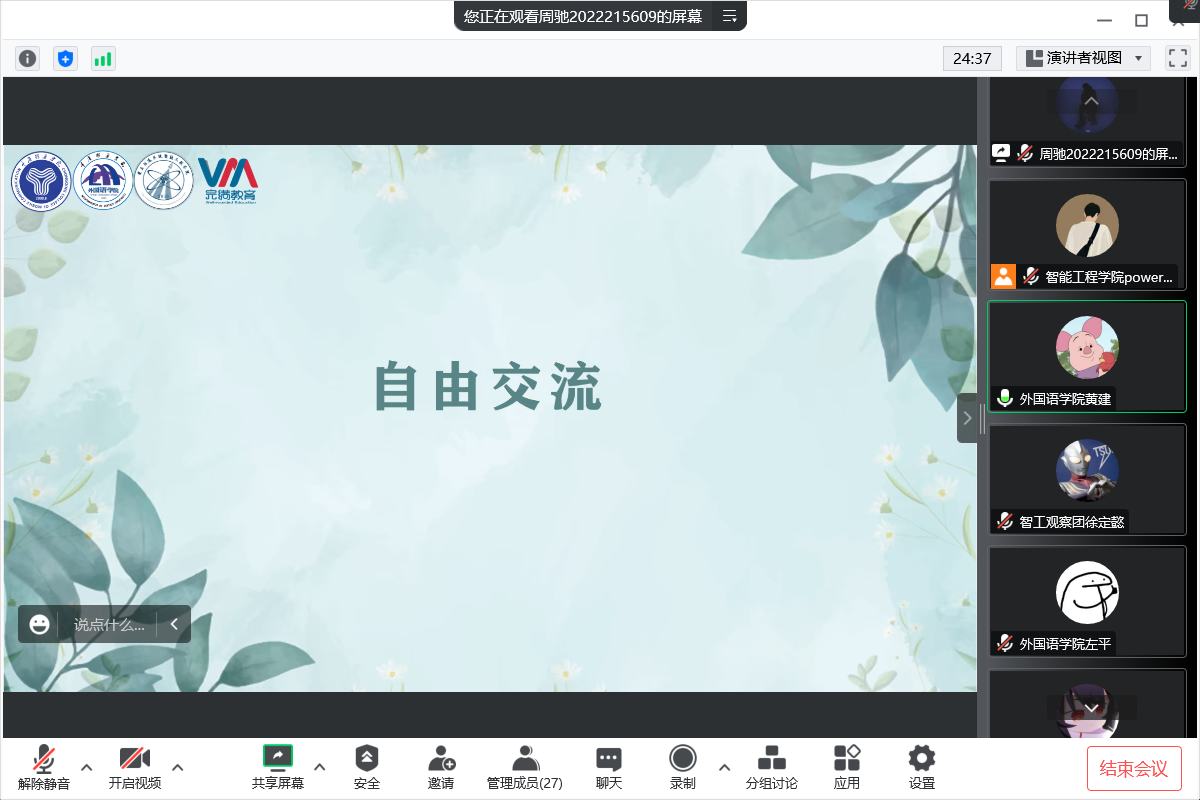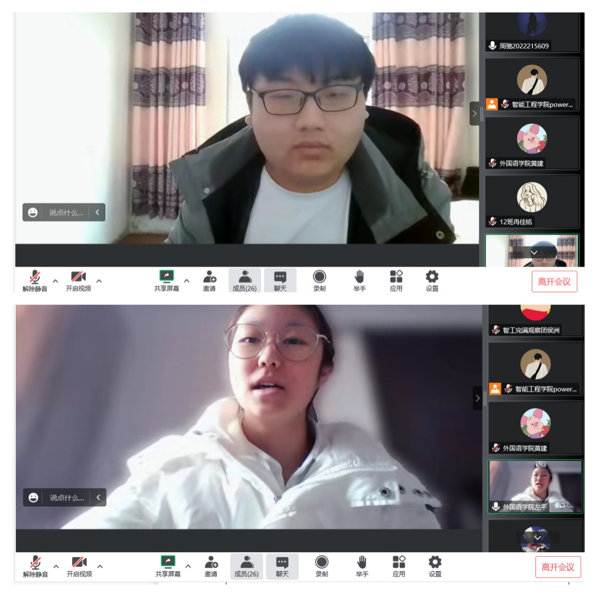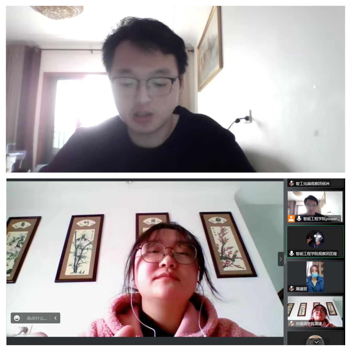 随之,智能工程学院Power完满观察团负责人陈汗东同学展示了本学期团队工作任务,指出团队采取以小组成员形式进行分工,以案例的形式分享了在观察活动中遇到的问题及解决措施。外国语学院Starlight完满观察团负责人黄建同学对工作进行了总结,提出了在疫情时期线上观察活动时遇到诸多问题,并与在座成员探讨有效措施。