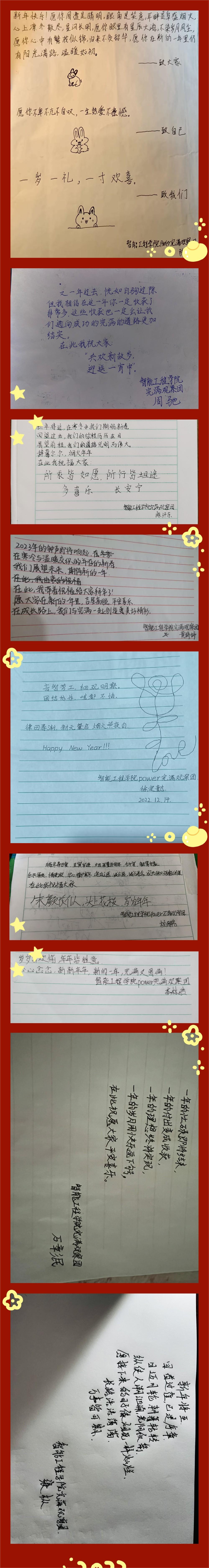 “短暂的离别是为了更好的相聚”,此次交流会在双方惜别中圆满落幕。智能工程学院Power完满观察团全体成员通过手写贺卡的方式为外国语学院Starlight完满观察团的老师和同学们送上了新年祝福。不畏将来,不念过往,相遇一场,手捧阳光。